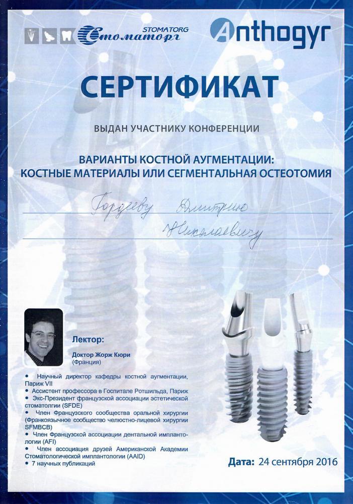 2016г. — Участник конференции «Варианты костной аугментации: костные материалы или сегментальная остеотомия». Лектор: Доктор Жорж Кюри (Франция)