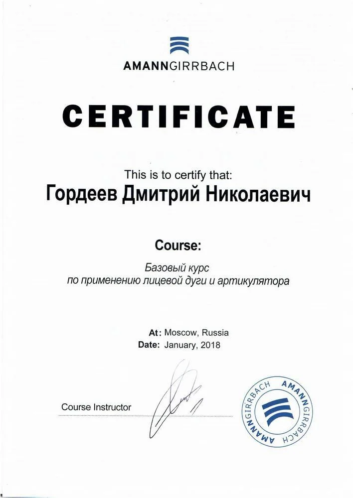 2018г. — Прошёл базовый курс по применению лицевой дуги и артикулятора AMANNGIRBACH.