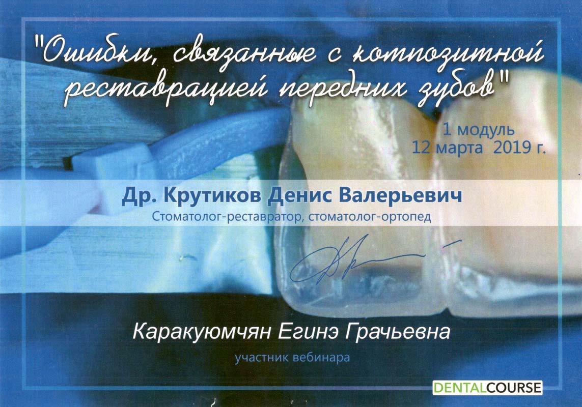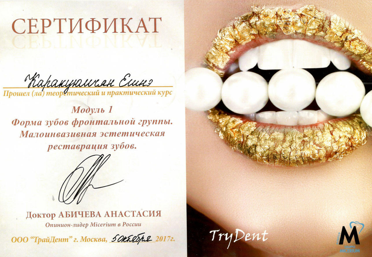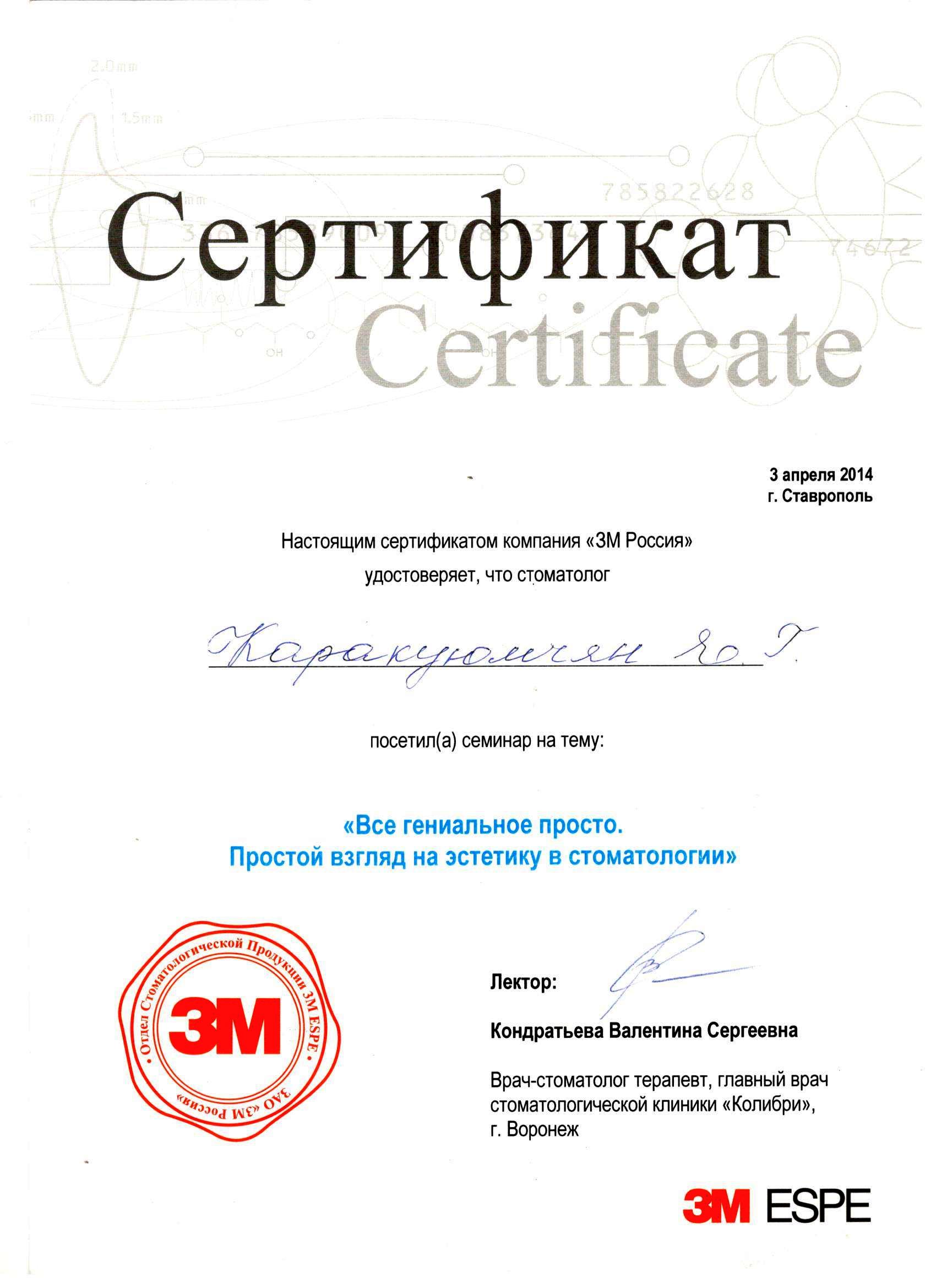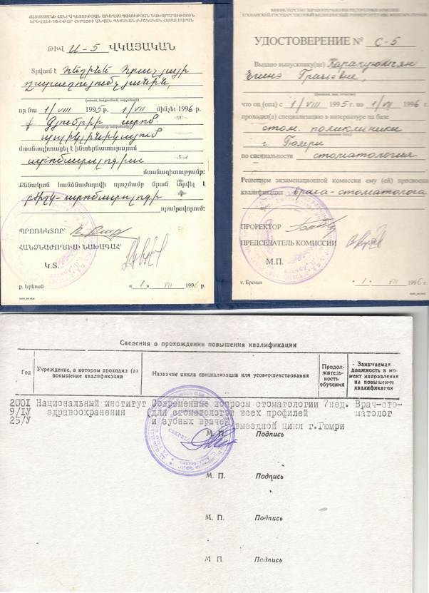 2013г. — Сертификат специалиста Стоматология общей практики" НОУ ЦПДО «Ставропольский институт повышения квалификации «Карьера Меди Фарм», г. Ставрополь. Сертификат действителен 5 лет.