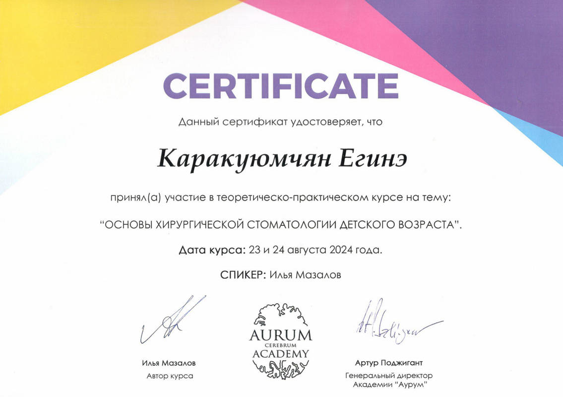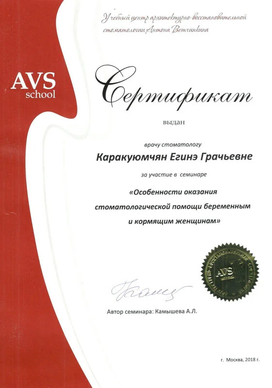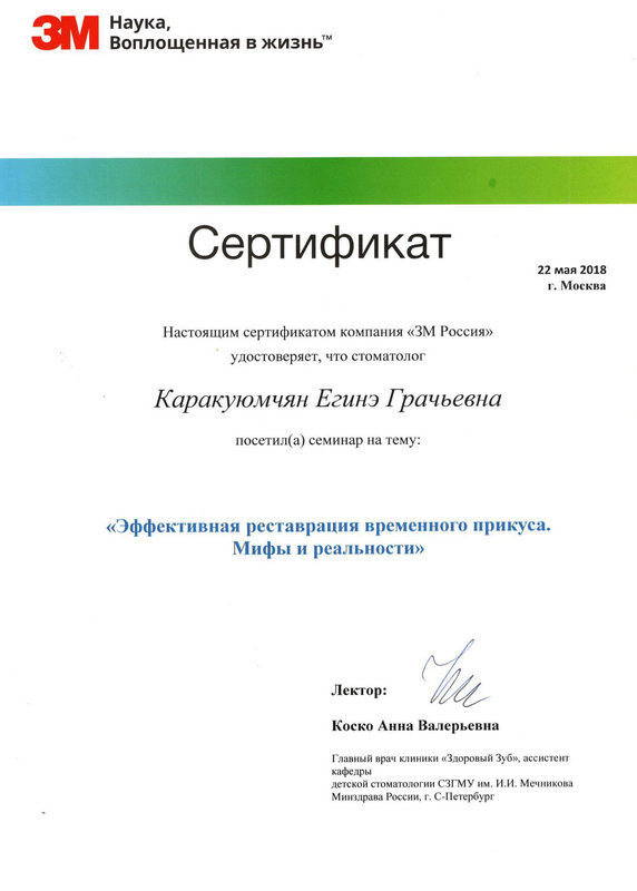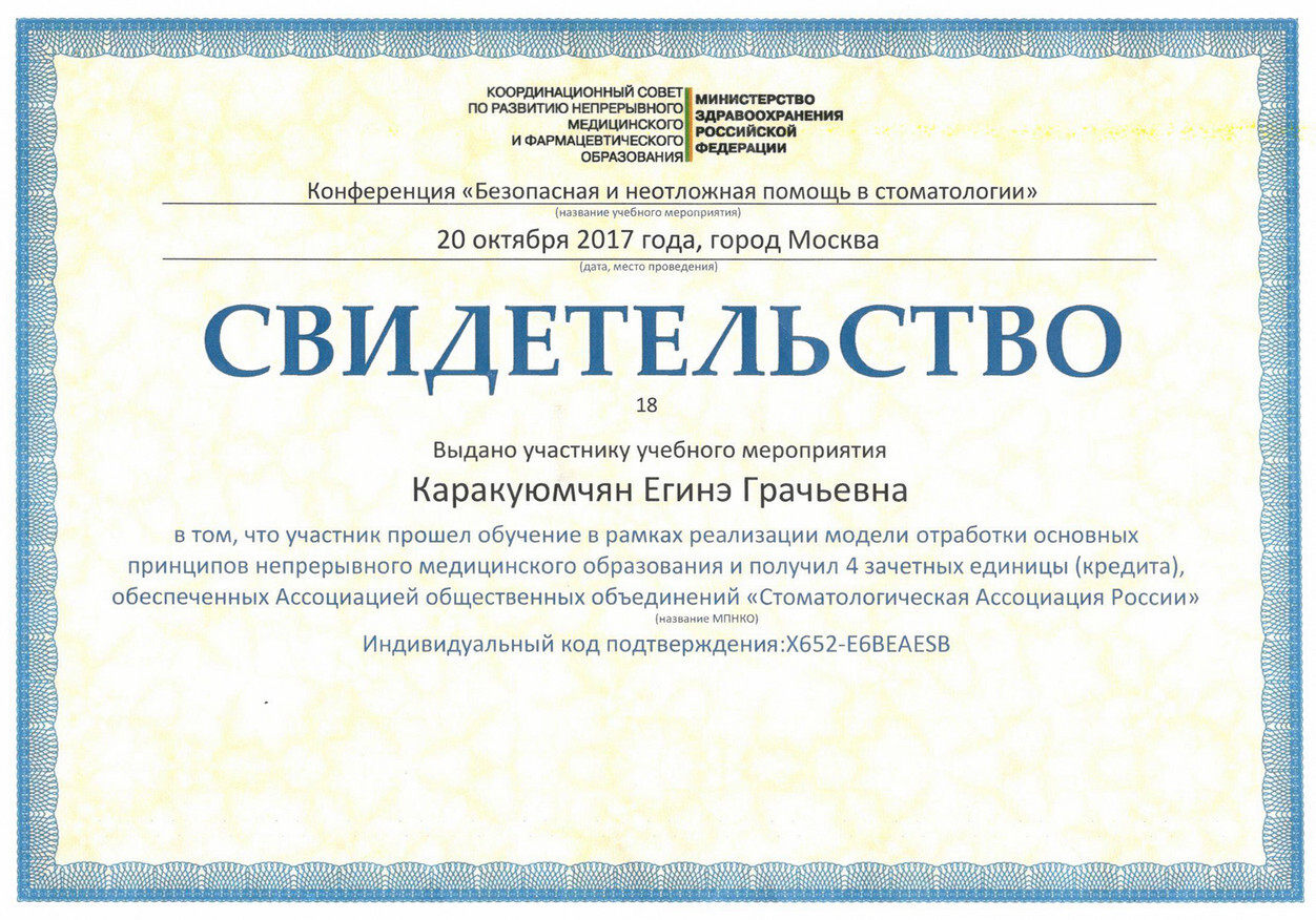 2013г. — Сертификат специалиста Стоматология общей практики" НОУ ЦПДО «Ставропольский институт повышения квалификации «Карьера Меди Фарм», г. Ставрополь. Сертификат действителен 5 лет.
