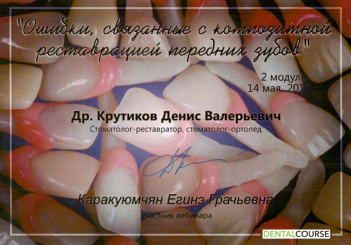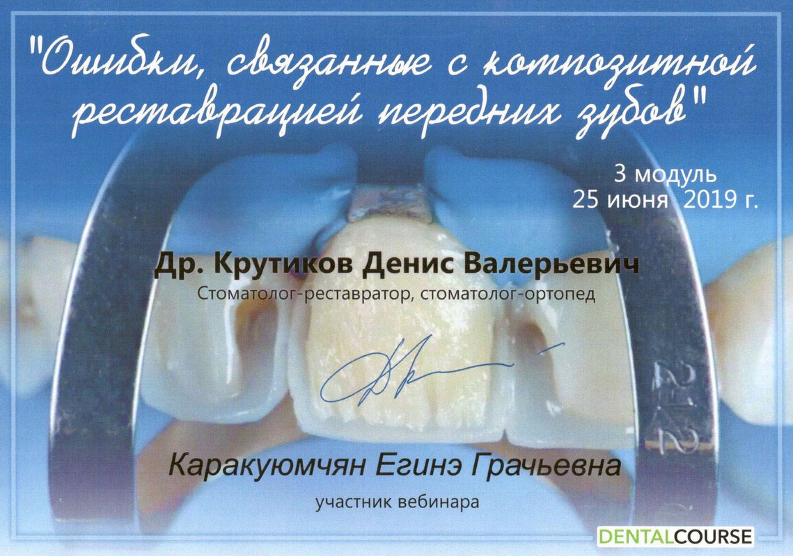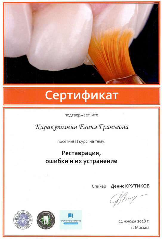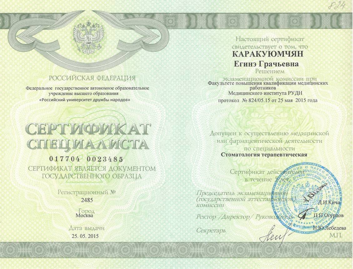 2015г. – Сертификат специалиста «Стоматология терапевтическая» Медицинский институт Российского университета дружбы народов, г. Москва. Сертификат действителен 5 лет.