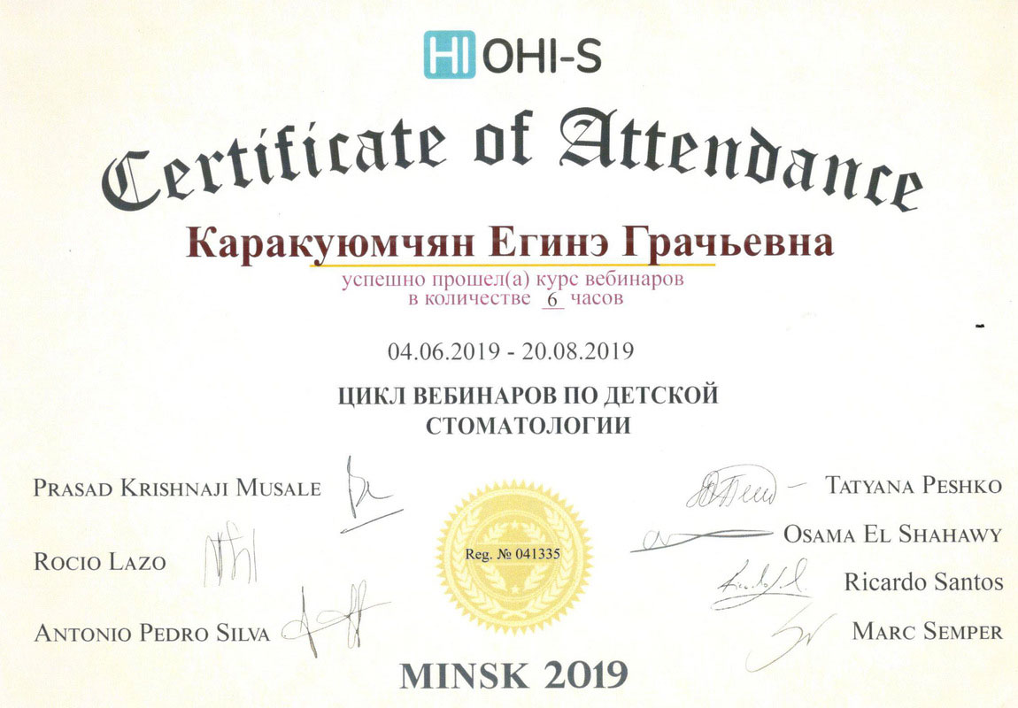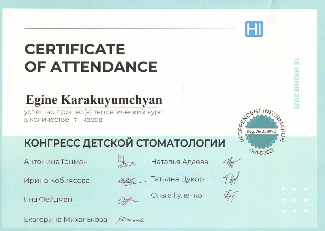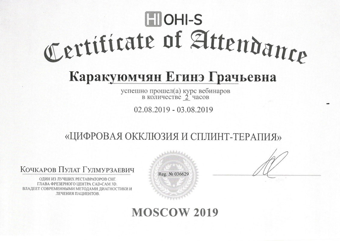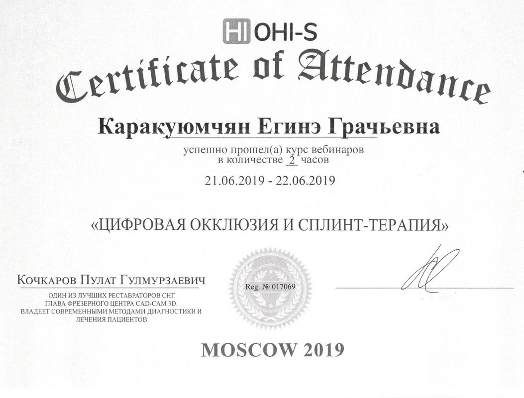 2015г. – Сертификат специалиста «Стоматология терапевтическая» Медицинский институт Российского университета дружбы народов, г. Москва. Сертификат действителен 5 лет.