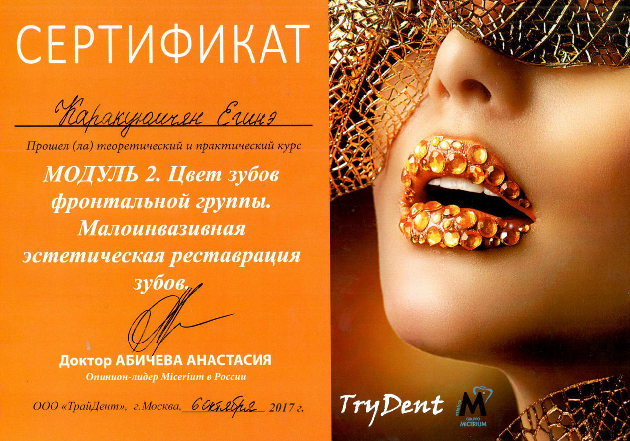 2017г. — Теоретический и практический курс «Форма зубов фронтальной группы. Малоинвазивная эстетическая реставрация зубов». Абичева Анастасия, г.Москва