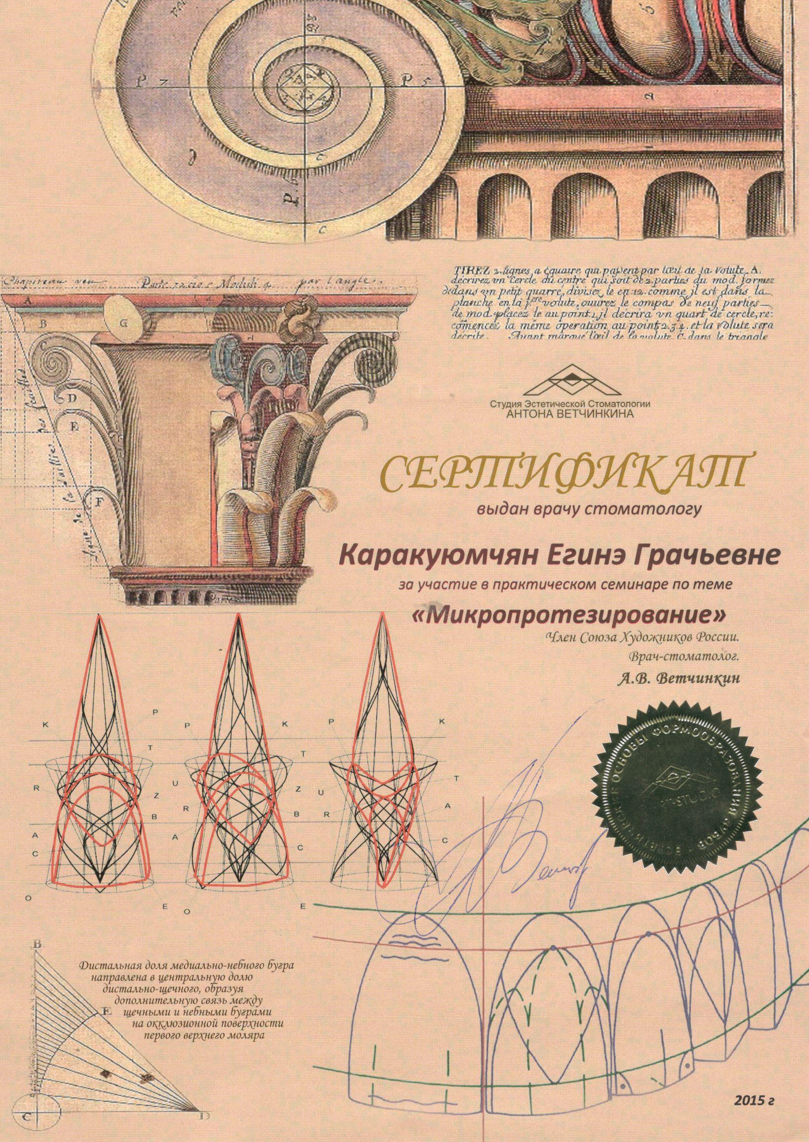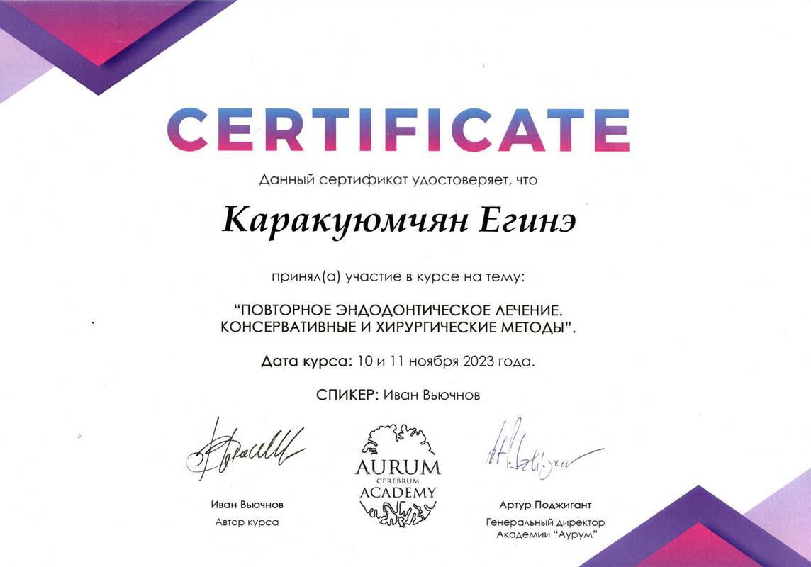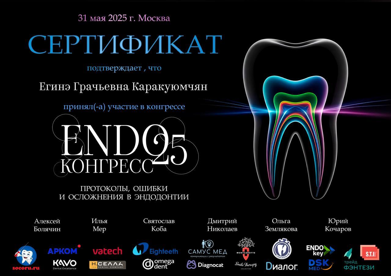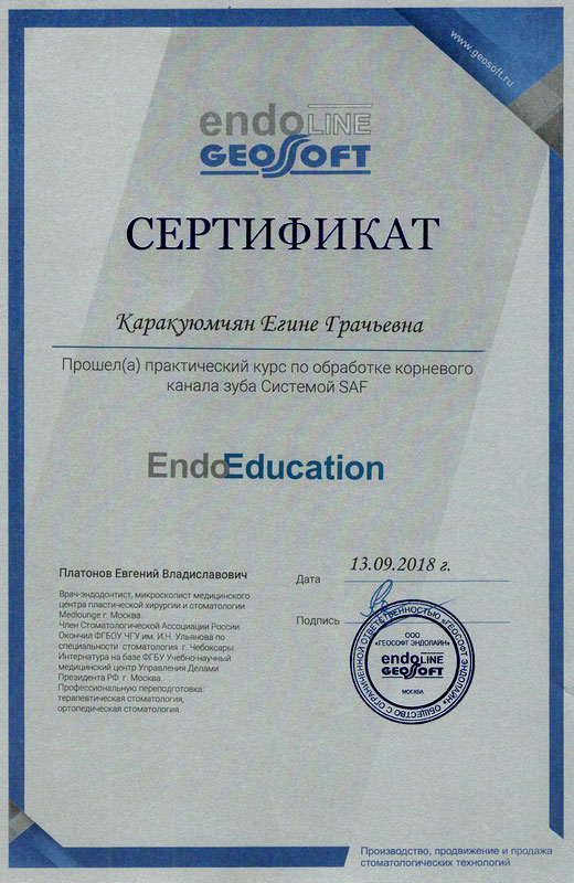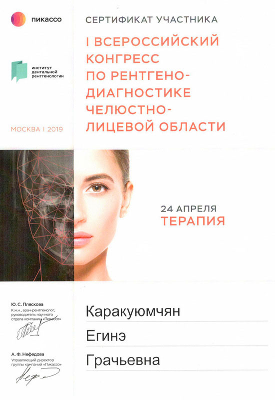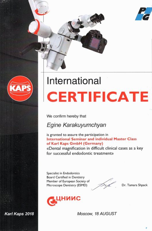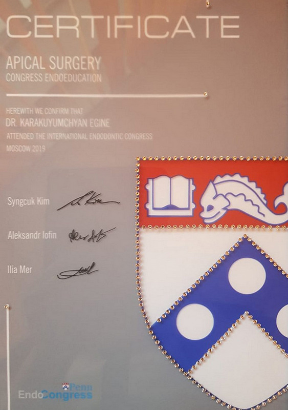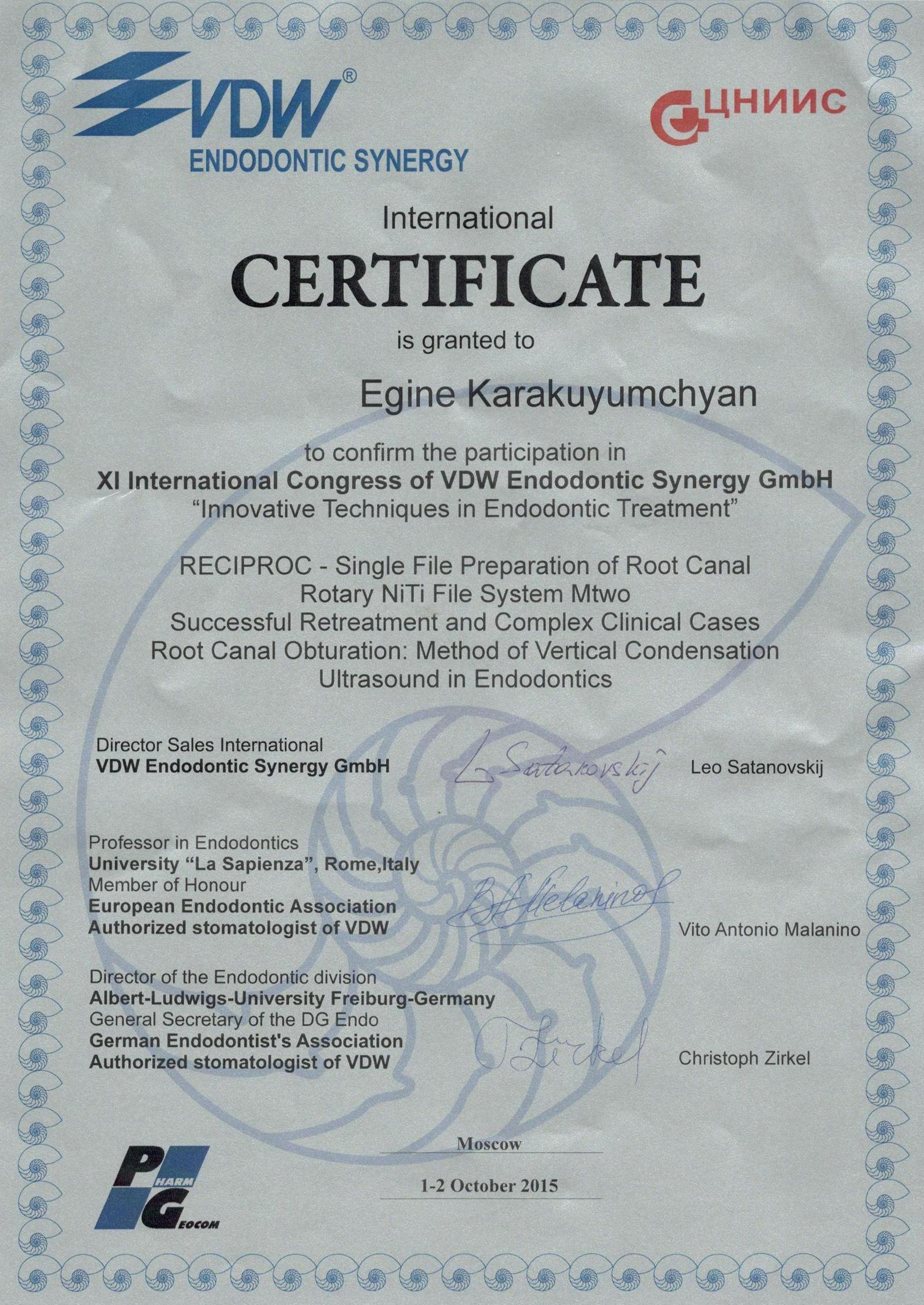 2015г. — International Certificate XI International Congress «Innovative Techniques in Endodontic Treatment» VDW Endodontic Synergy, Moscow