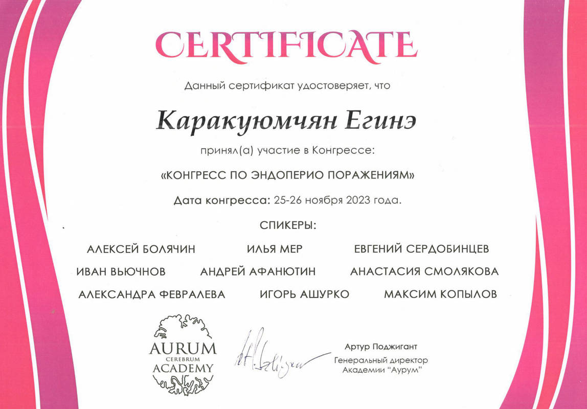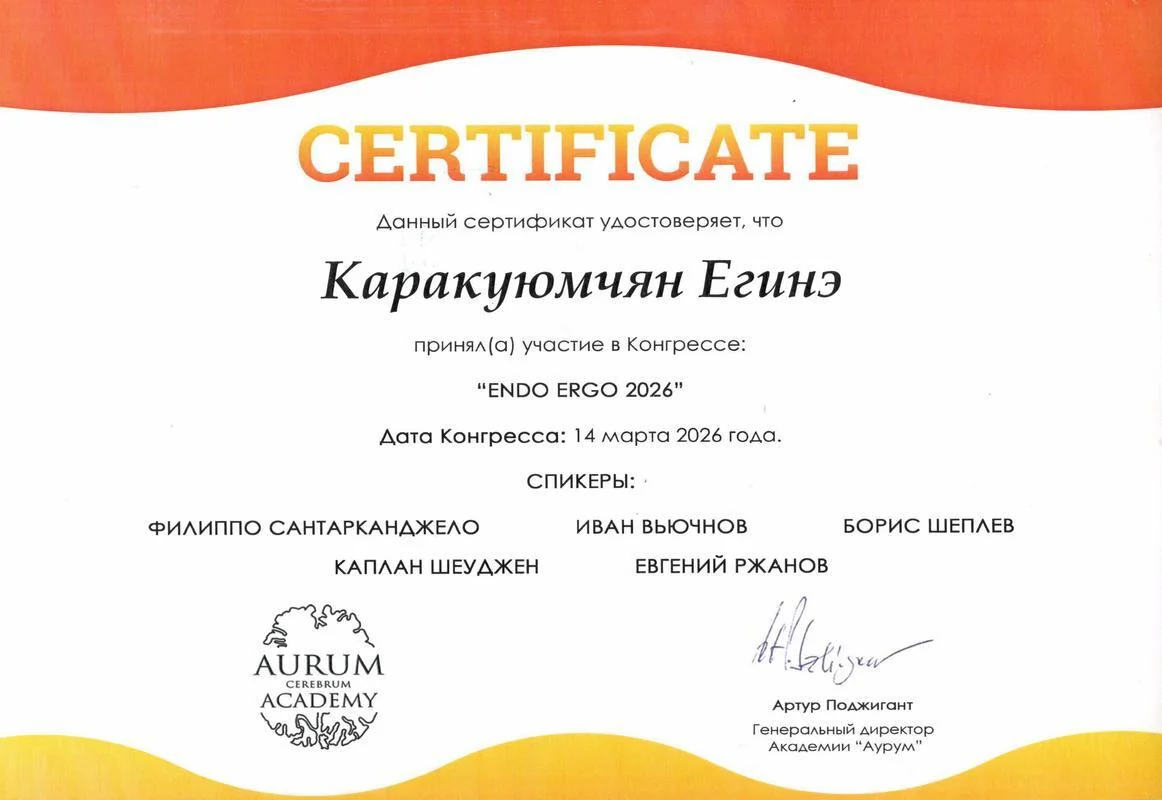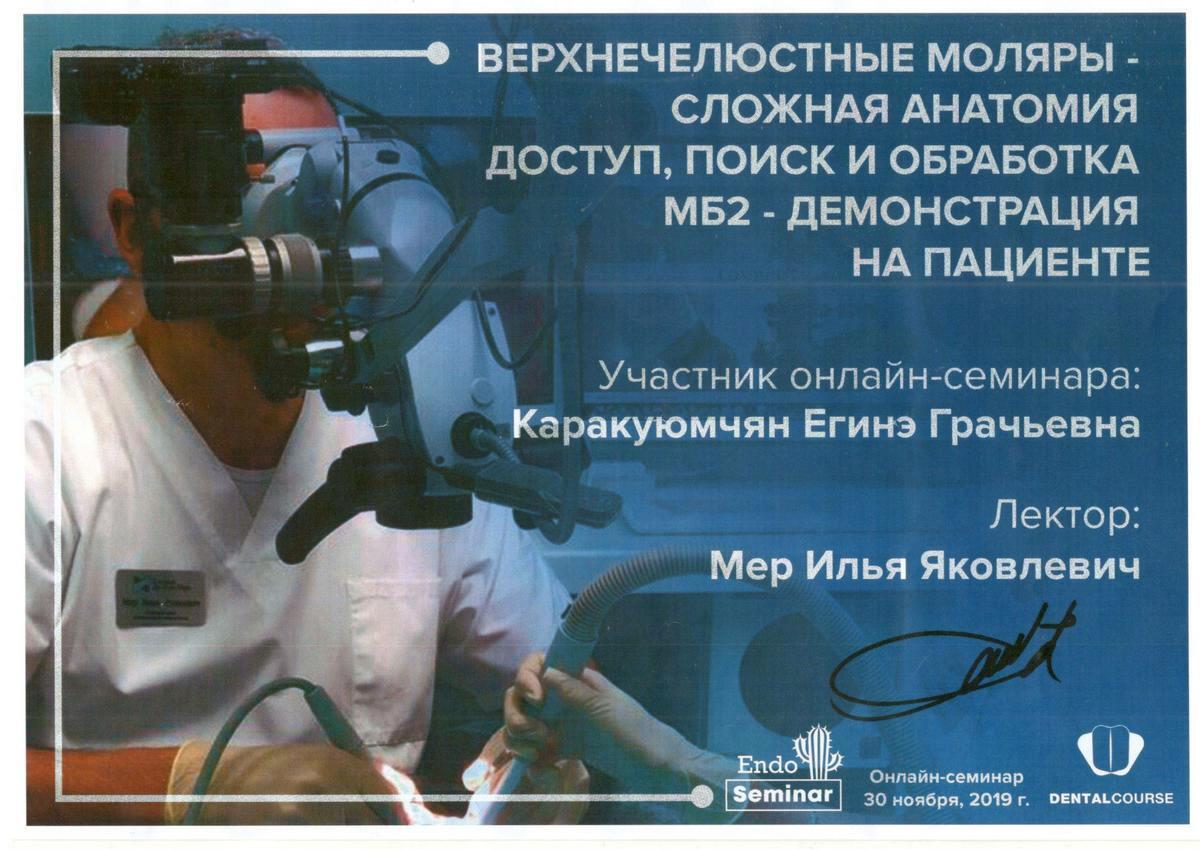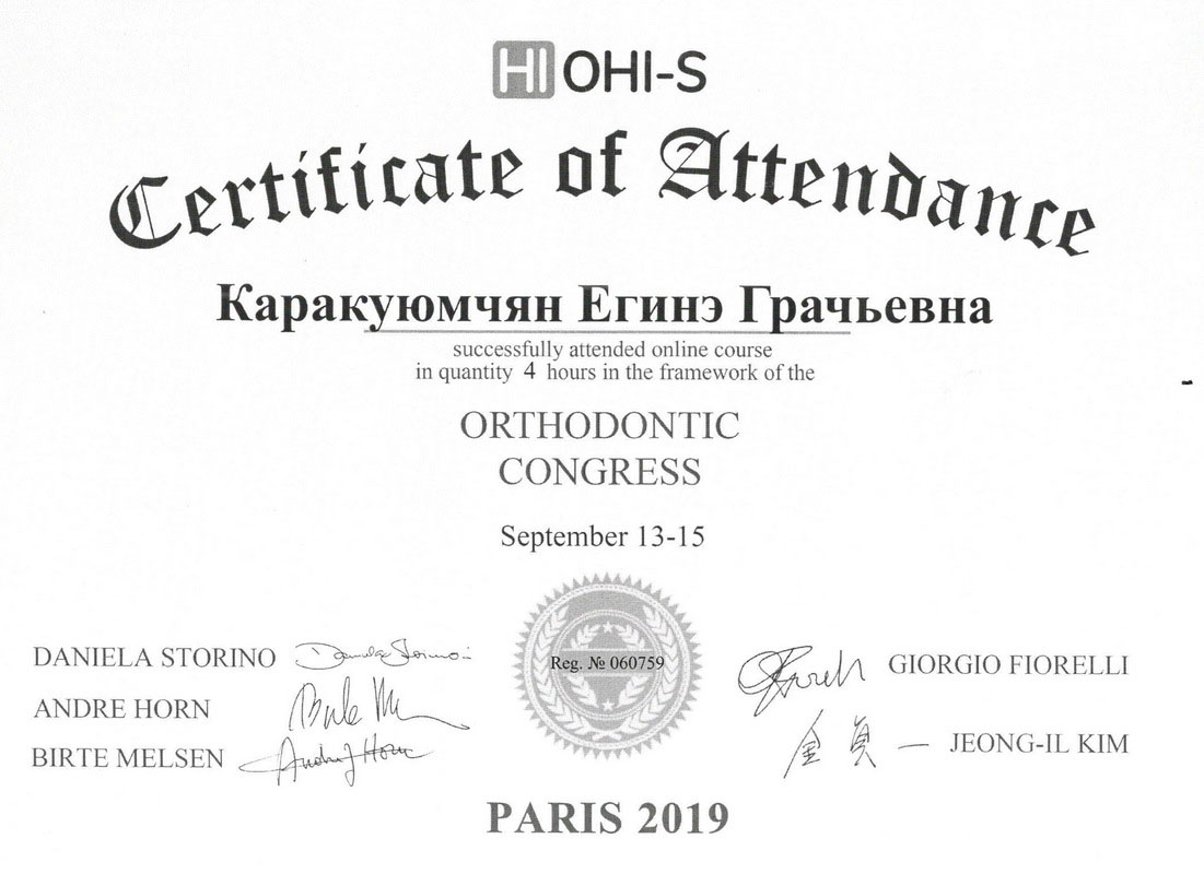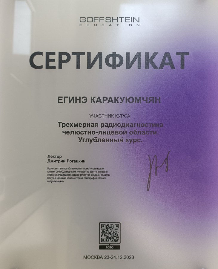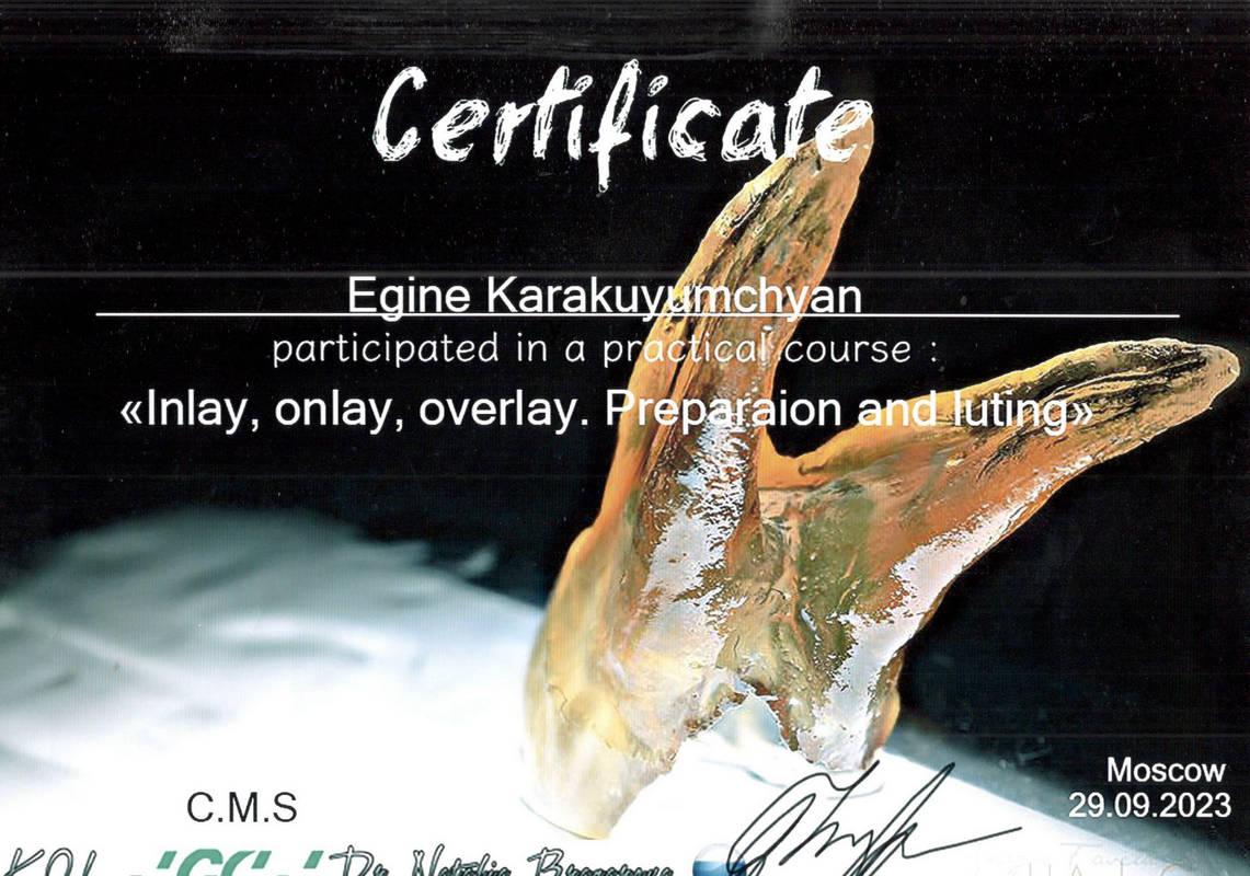 2015г. — International Certificate XI International Congress «Innovative Techniques in Endodontic Treatment» VDW Endodontic Synergy, Moscow