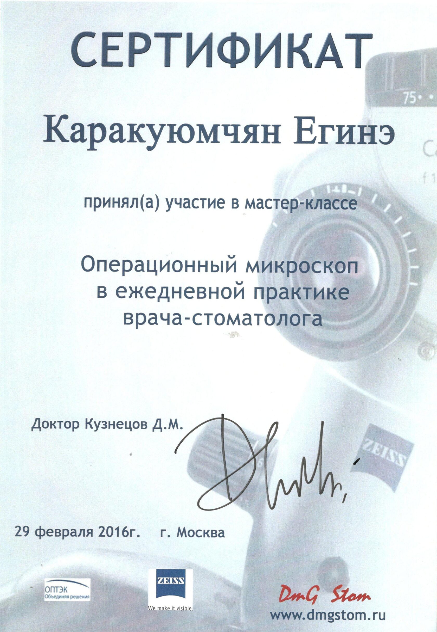 2016г. — Мастер-класс «Операционный микроскоп в ежедневной практике врача-стоматолога». DmG Stom, г.Москва