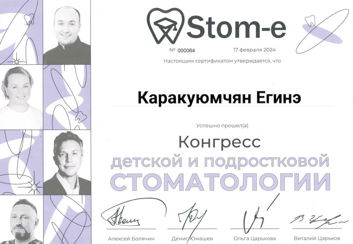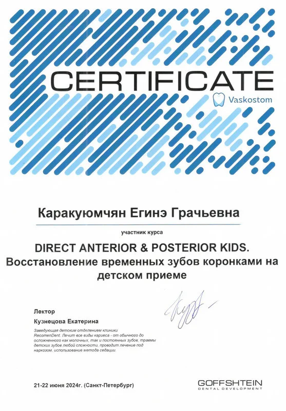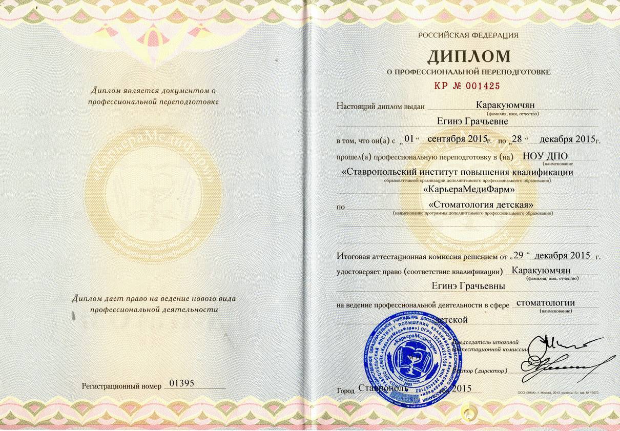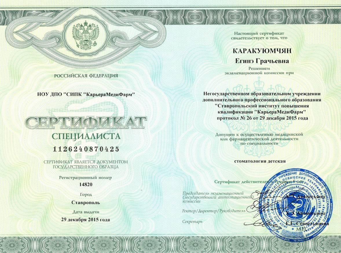 2015г. – Диплом о профессиональной переподготовке и сертификат специалиста «Стоматология детская» НОУ ЦПДО «Ставропольский институт повышения квалификации «Карьера Меди Фарм»», г. Ставрополь. Сертификат действителен 5 лет.