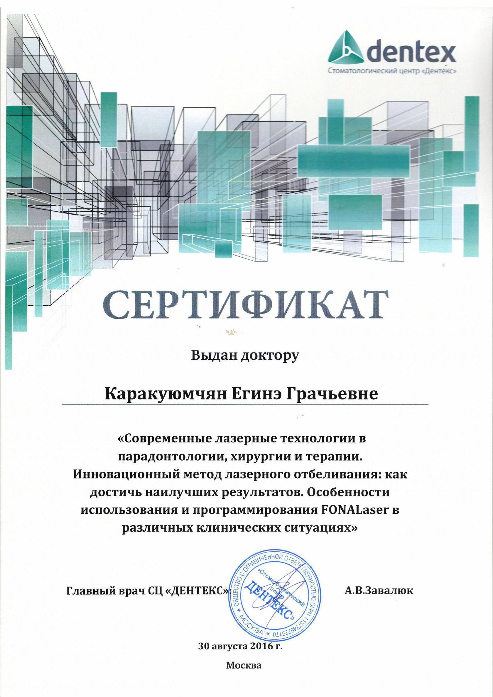 2016г. — «Современные лазерные технологии в пародонтологии, хирургии и терапии. Инновационный метод лазерного отбеливания: как достичь наилучших результатов. Особенности использования и программирования FONALaser в различных клинических ситуациях». Dentex, г.Москва