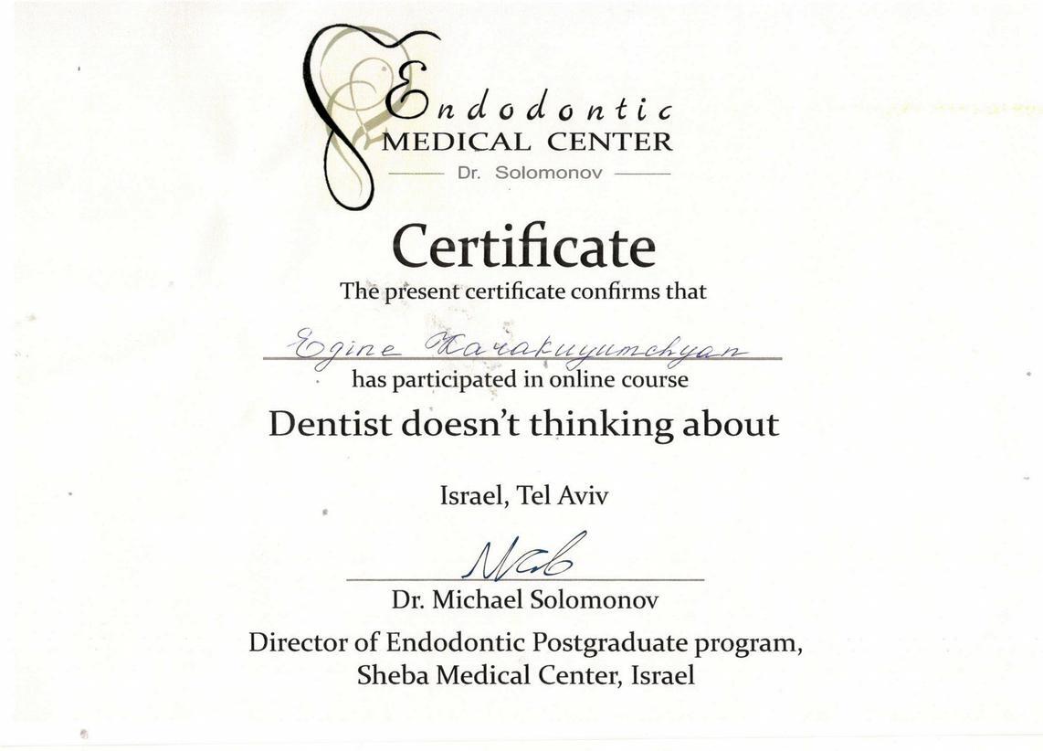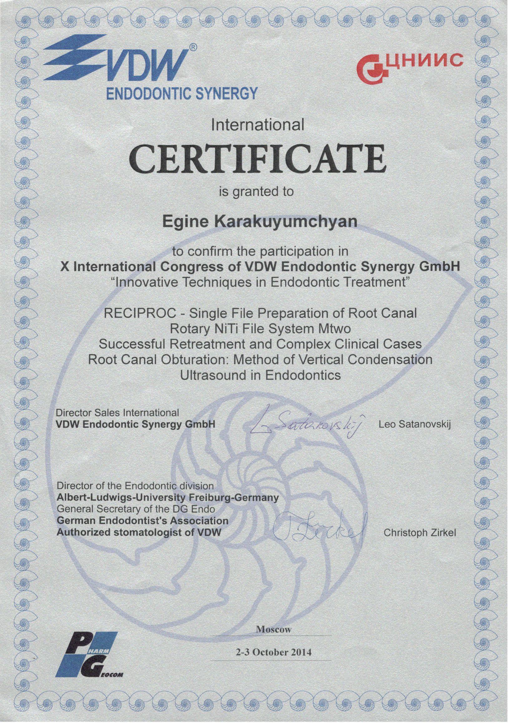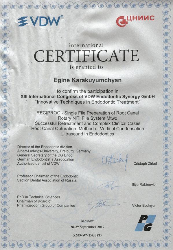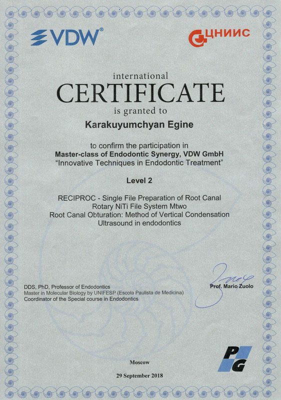 2014г. — VDW Endodontic synergy «Innovative Techniques in Endodontic Treatment». International certificate