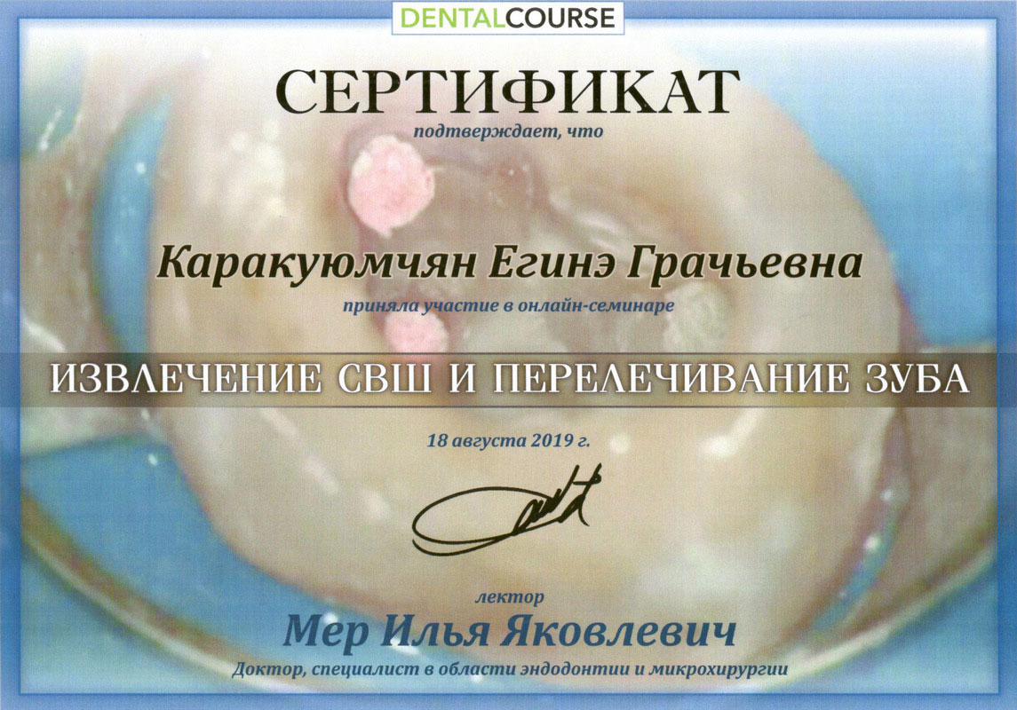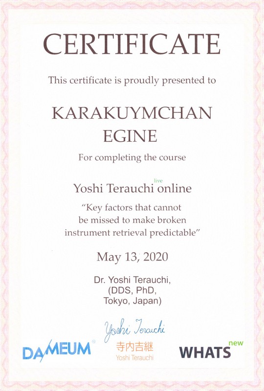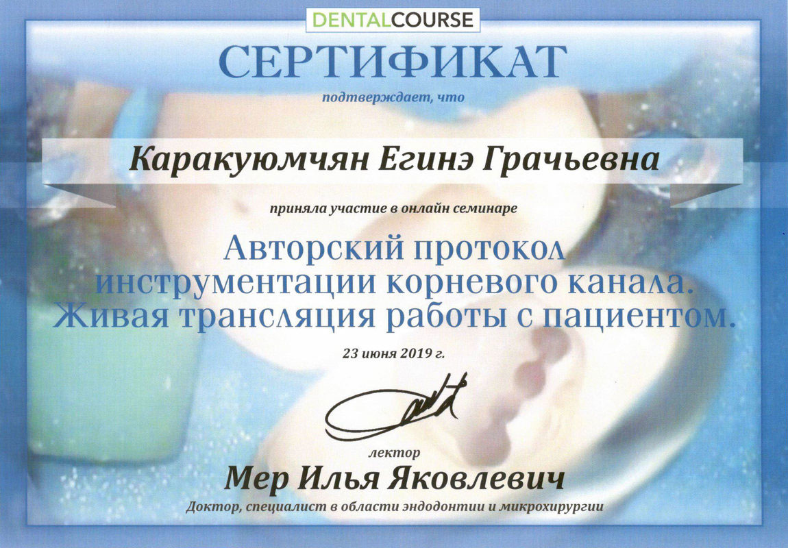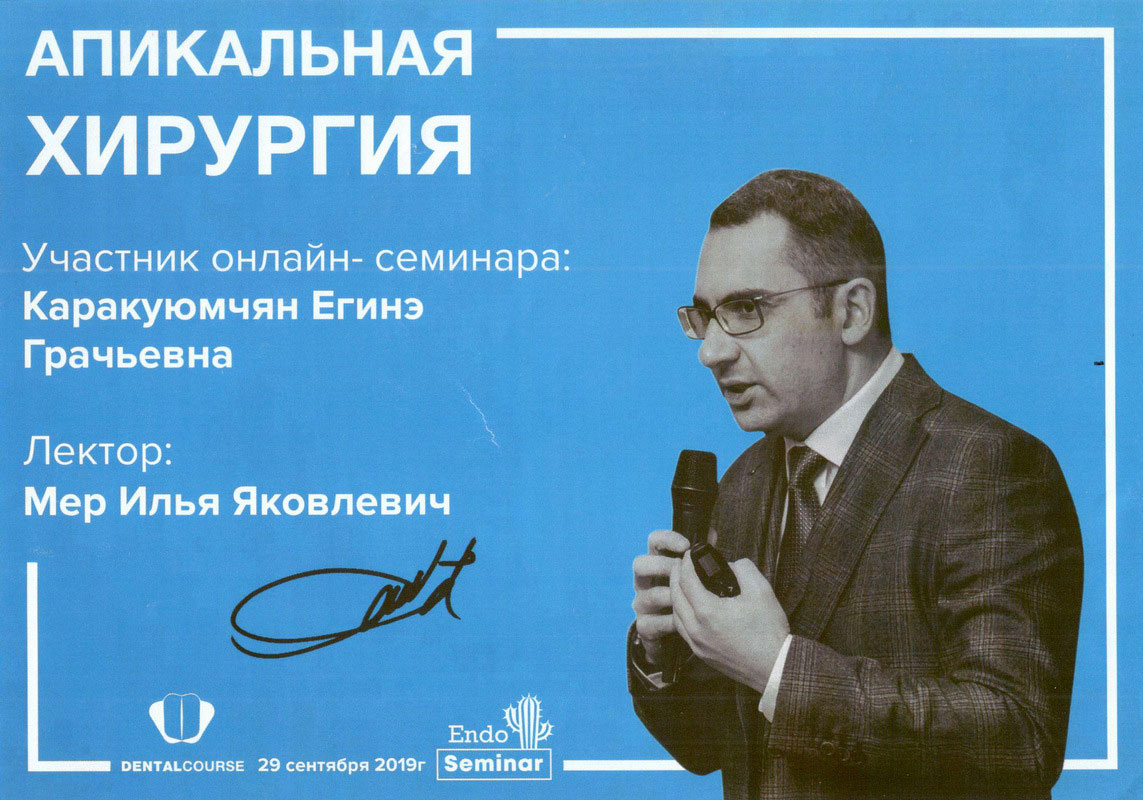2014г. — VDW Endodontic synergy «Innovative Techniques in Endodontic Treatment». International certificate