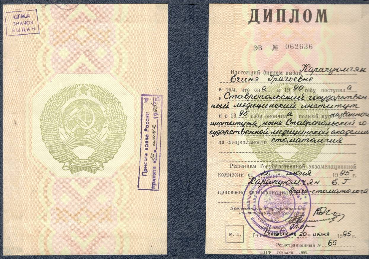 1995г. – Окончила «Ставропольская государственная медицинская академия», г. Ставрополь по специальности «Стоматология». Присвоена квалификация «Врач-стоматолог».