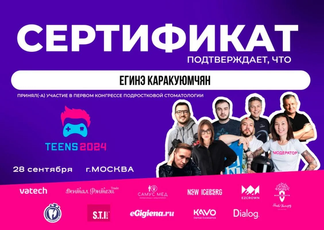 2024г. — «Приняла участие в первом конгрессе подростковой стоматологии», г.Москва