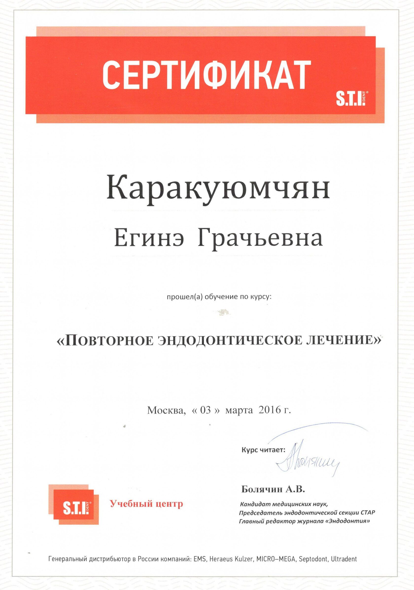 2016г. — Курс «Повторное эндодонтическое лечение». STIDENT, г.Москва