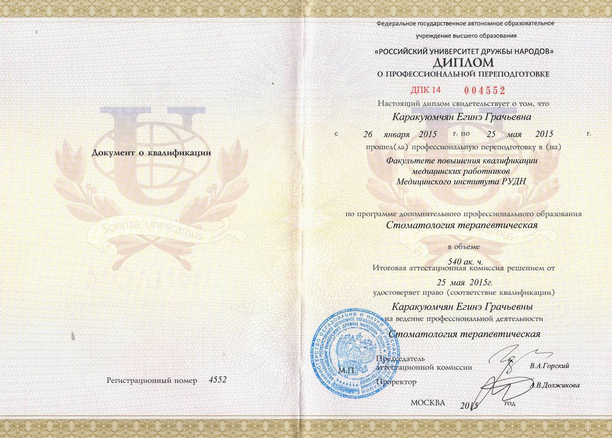 2015г. – Диплом о профессиональной по программе «Стоматология терапевтическая» Медицинский институт Российского университета дружбы народов, г. Москва