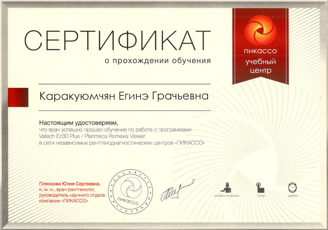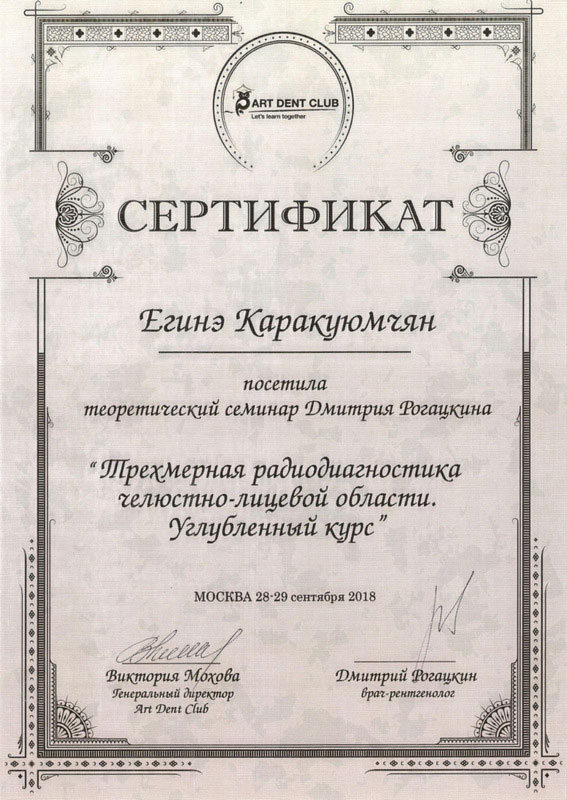 2018г. — Сертификат о прохождении обучения по работе с программами Vatech Ez3D Plus/ Planmeca Romexis Viewer, г.Москва.