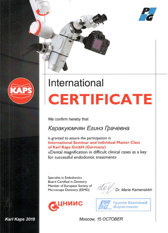 2018г. — Master Class of Karl Kaps GmbH (Germany) «Dental magnification in difficult clinical cases as a key for successful endodontic treatment». Dr. Maria Kamenskik, Moscow