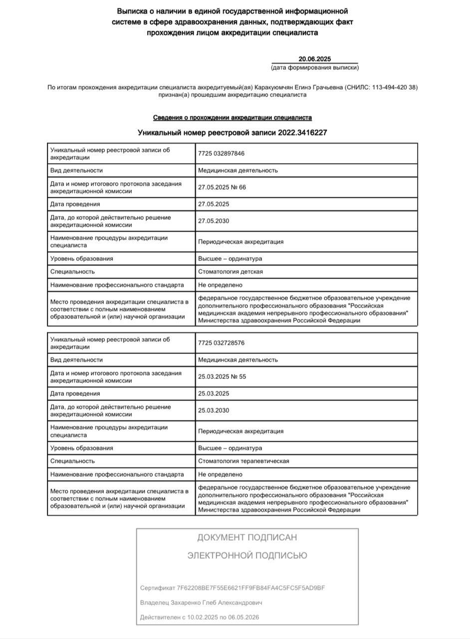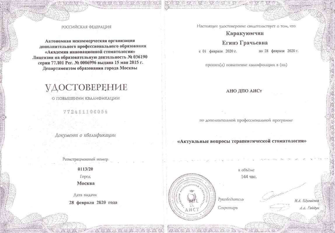 2020г. – Диплом о профессиональной переподготовке и сертификат специалиста «Стоматология терапевтическая» АНО ДПО «Академия инновационной стоматологии, г. Москва. Сертификат действителен 5 лет.