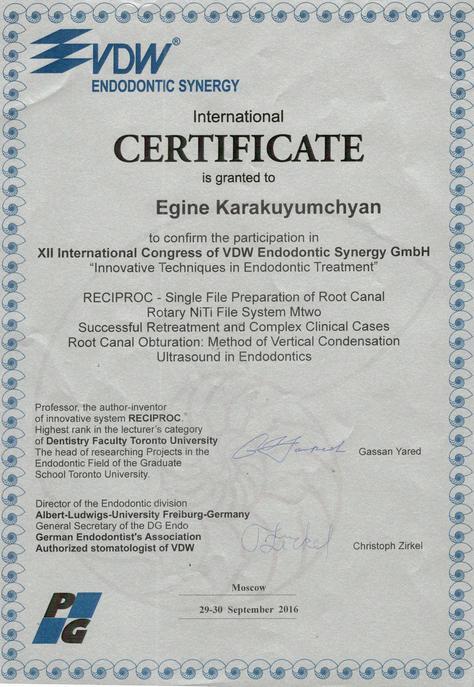 2016г. — International Certificate XII International Congress «Innovative Techniques in Endodontic Treatment» VDW Endodontic Synergye, Moscow