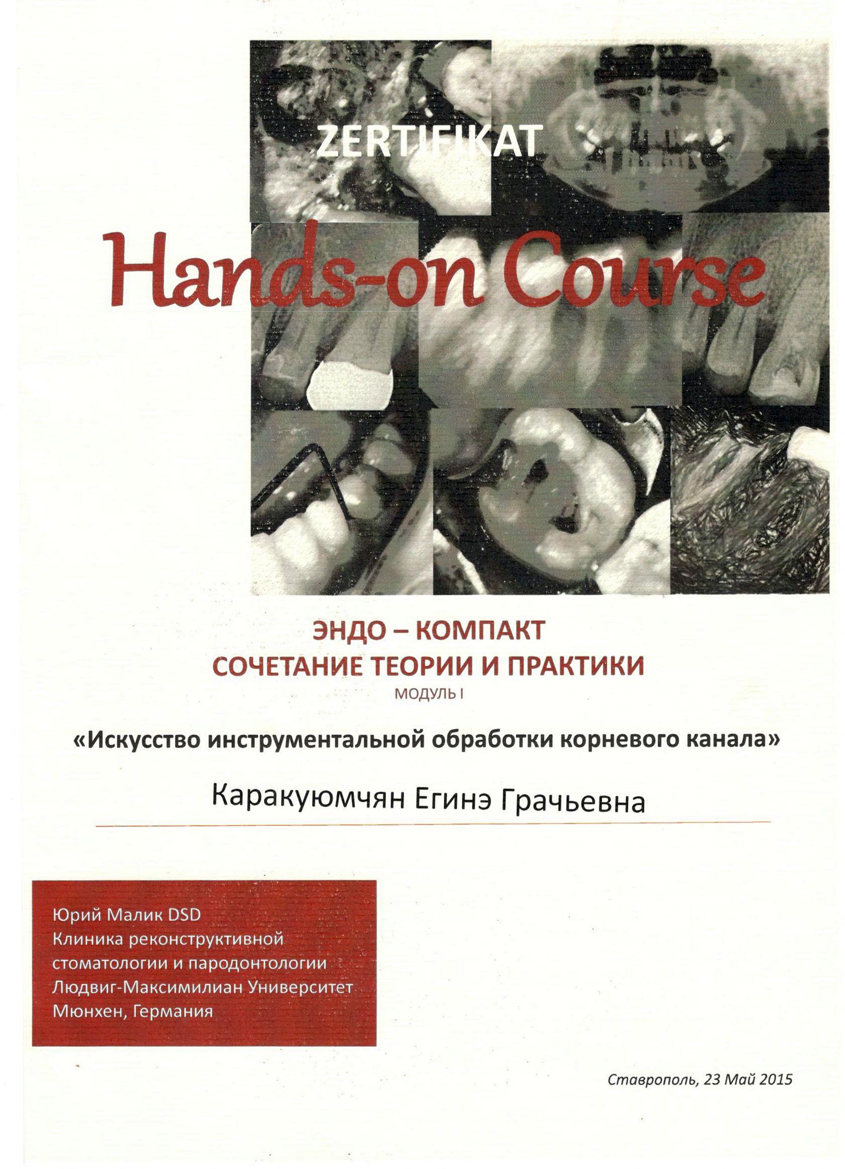 2015г. — Hands-on Course Эндо-Компакт Сочетание теории и практики (модуль I). «Искусство инструментальной обработки корневого канала, г.Ставрополь