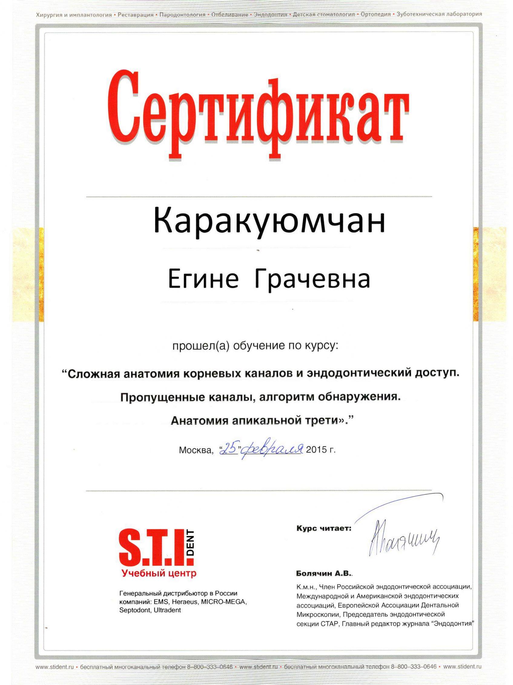 2015г. — Учебный центр STI Dent курс «Сложная анатомия коневых каналов и эндодонтический доступ. Пропущенные каналы, алгоритм обнаружения. Анатомия апикальной трети»