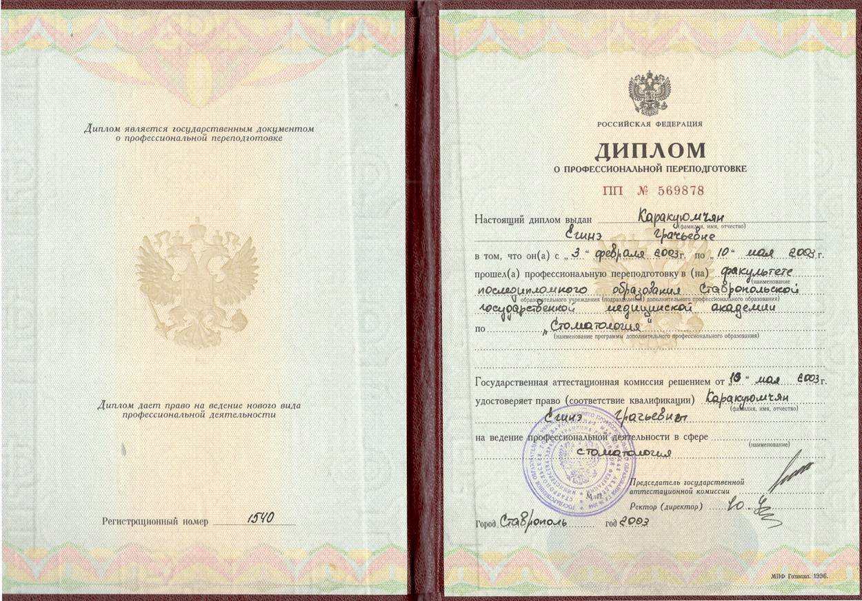 2003г. – Диплом о профессиональной переподготовке на факультете последипломного образования «Ставропольская государственная медицинская академия» по программе «Стоматология», г. Ставрополь.