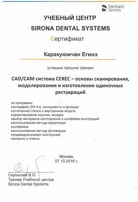 2016г. — CAD-CAM система CEREC -основы сканирования, моделирования и изготовления одиночных реставраций. Учебный центр SIRONA DENTAL SYSTEMS, г.Москва