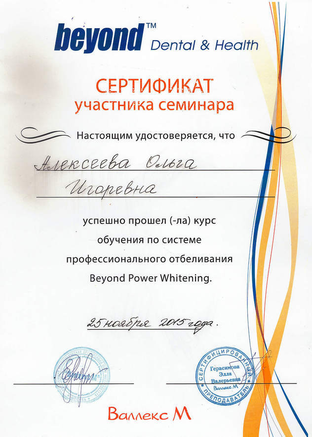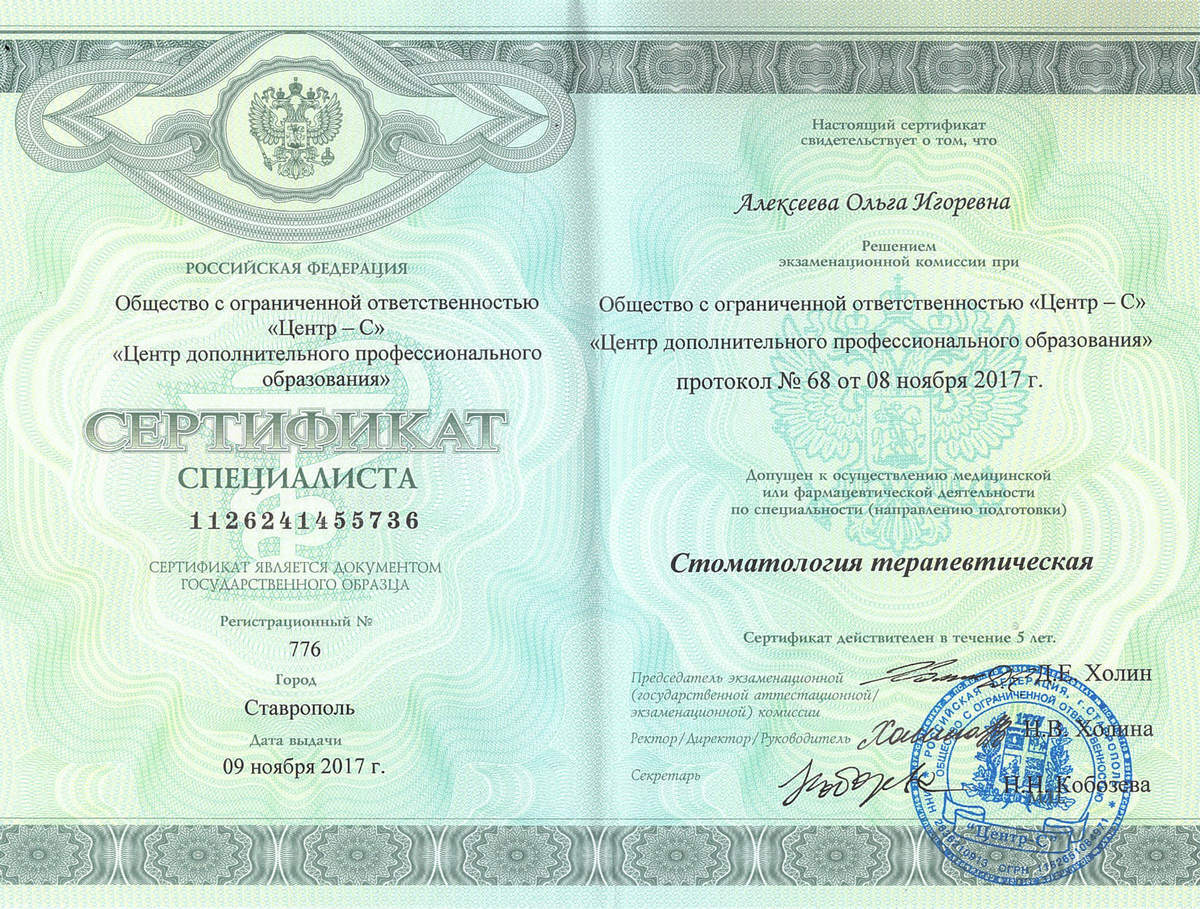 2013г. — Прошла профессиональную переподготовку в Ставропольском институте повышения квалификации «КарьераМедиФарм». Специальность - Стоматология терапевтическая