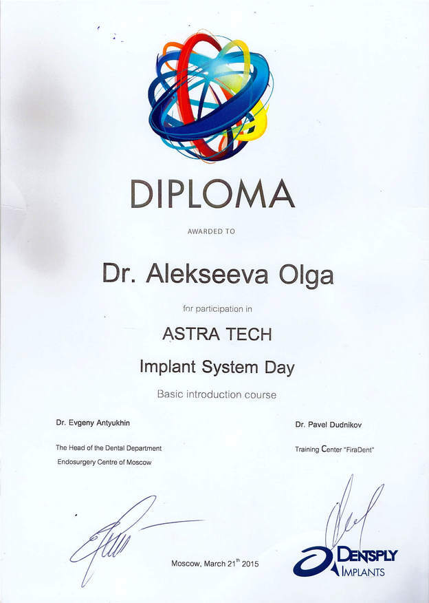 2013г. — Прошла обучение в интернатуре при кафедре стоматологии «СИНМФО». Специальность - Стоматология общей практики