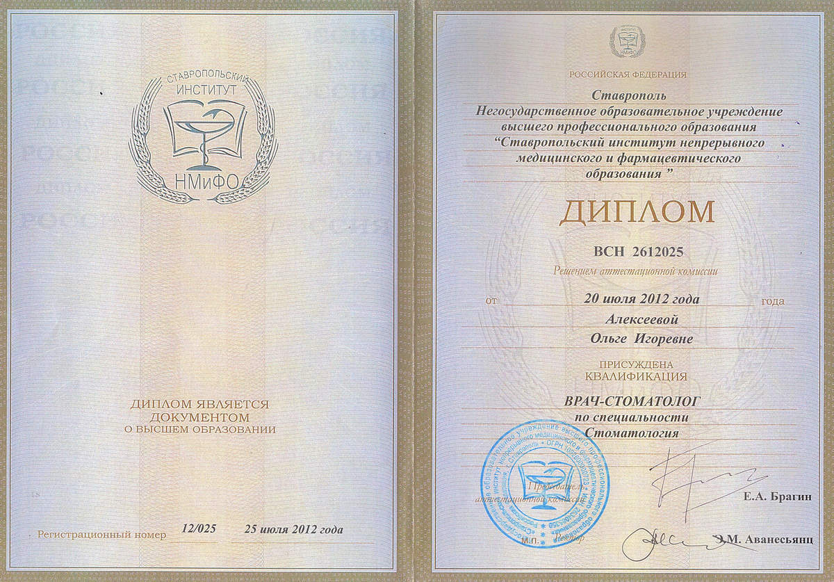 2012г. — закончила НОУ «Ставропольский институт непрерывного медицинского и фармацевтического образования». Специальность - Стоматология. Квалификация - Врач - стоматолог