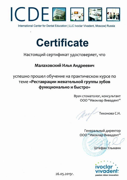 2015г. – Программа учебного курса состоит из двух модулей: Секреты реставраций в эстетически значимой зоне. Реставрации жевательной группы зубов функционально и быстро