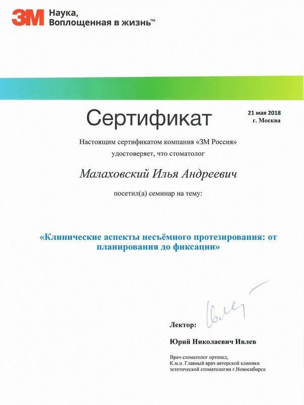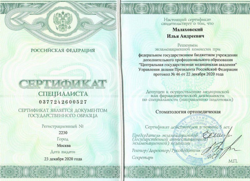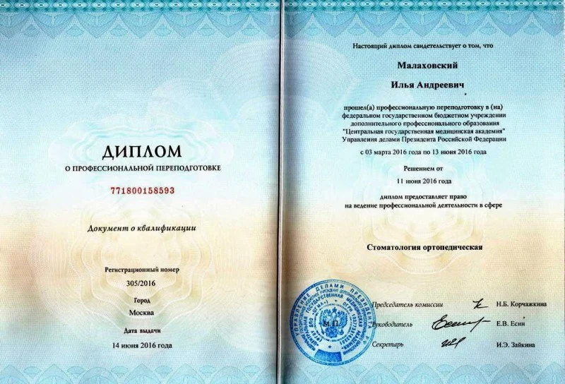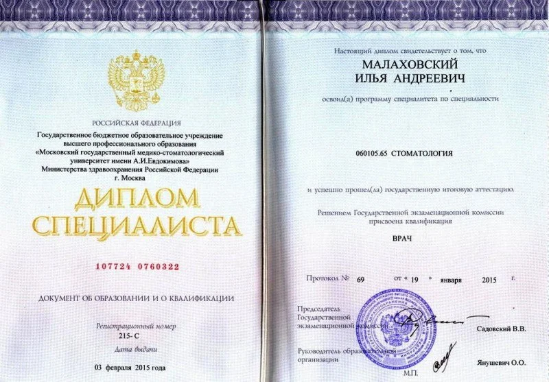 2015г. – Диплом по специальности «Стоматологический», Московский государственный медико—стоматологический университет им. А. И. Евдокимова