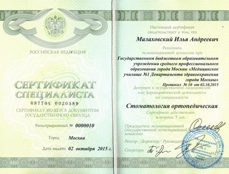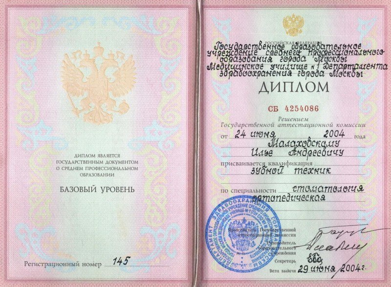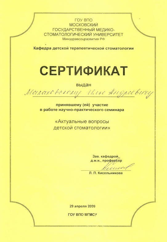 2009г. – Диплом по специальности «Зубной врач», Московское медицинское училище № 1