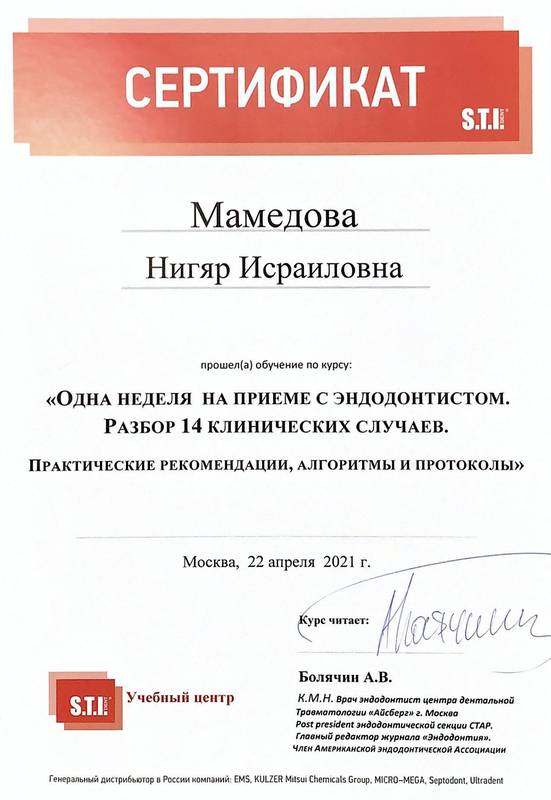 обучение по курсу: «Одна неделя на приёме с эндодонтистом. Разбор 14 клинических случаев. Практические рекомендации, алгоритмы, протоколы», курс читает А.В. Болячин, г.Москва;