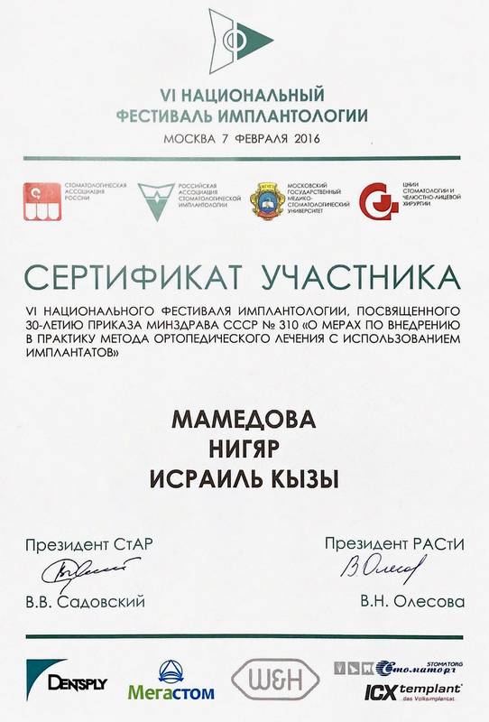 учебное мероприятие: «Конгресс стоматологов -Новые горизонты 2016», обучение в рамках реализации модели отработки основных принципов непрерывного медицинского образования, 6 зачетных единиц (кредитов), обеспеченных Ассоциацией общественных обьединений «Стоматологическая ассоциация России», лекторы: Филиппо Сантарканджело, А.Акулович, Илья Мер, А.Кожемяк, Вальтер Диас, г.Москва;