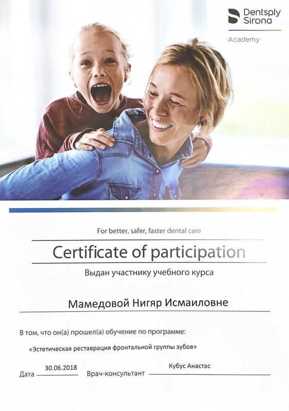 Сертификат специалиста, Федеральное государственное бюджетное учреждение «Национальный медико-хирургический Центр имени Н.И. Пирогова» Министерства здравоохранения Российской Федерации, Институт усовершенствования врачей, г.Москва, допущена к осуществлению медицинской или фармацевтической деятельности по специальности (направлению подготовки) «Стоматология терапевтическая». Сертификат действителен 5 лет;
