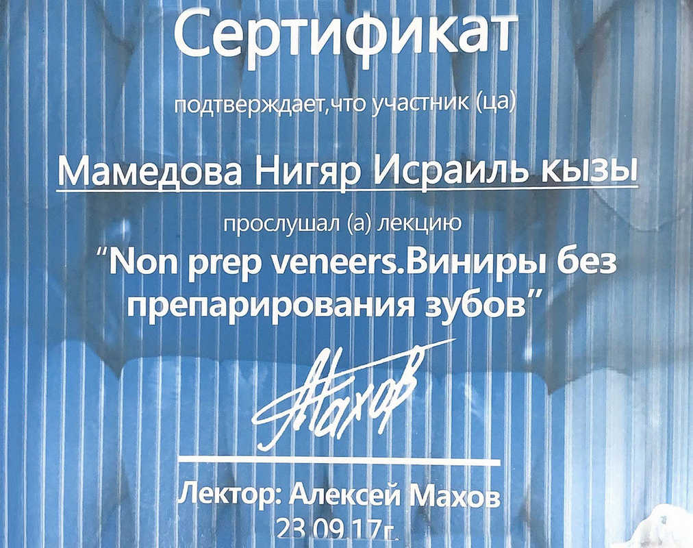 Сертификат специалиста, Государственное бюджетное образовательное учреждение высшего профессионального образования Первый Московский государственный медицинский университет им. И.М. Сеченова, г.Москва, допущена к осуществлению медицинской или фармацевтической деятельности по специальности «Стоматология терапевтическая». Сертификат действителен 5 лет;