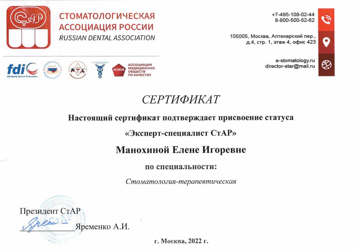 томатологическая Ассоциация России. Сертификат «Эксперт-специалист СтАР», Яременко А.И.