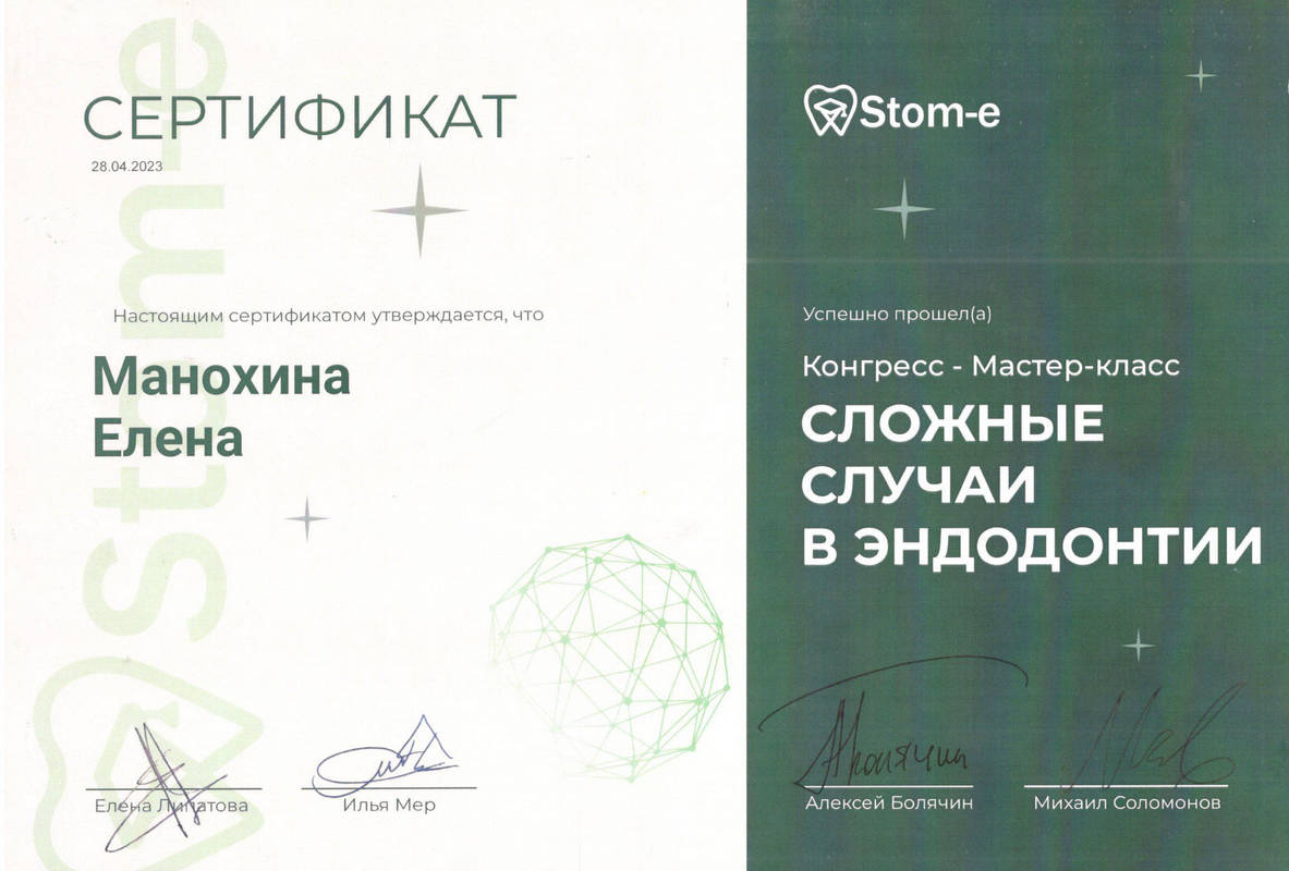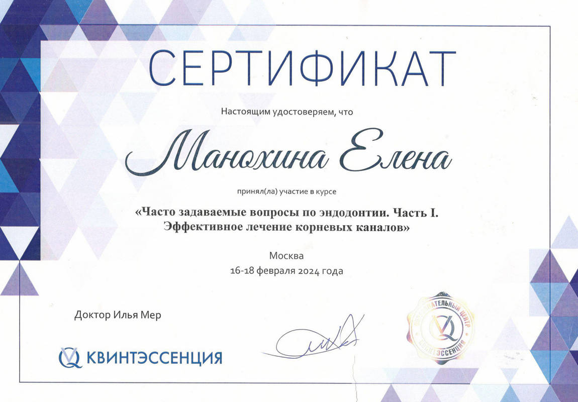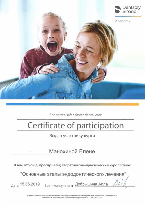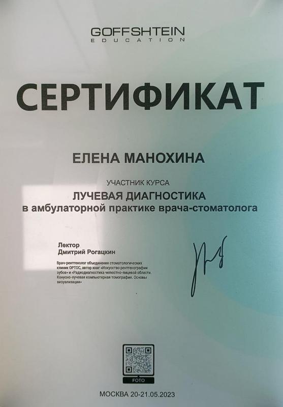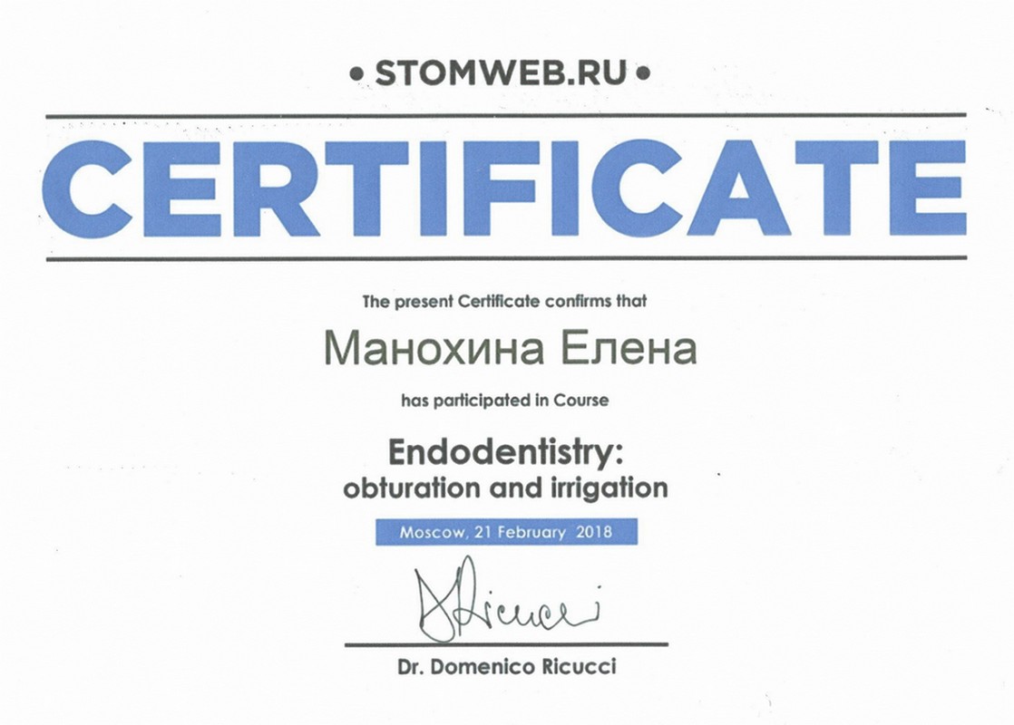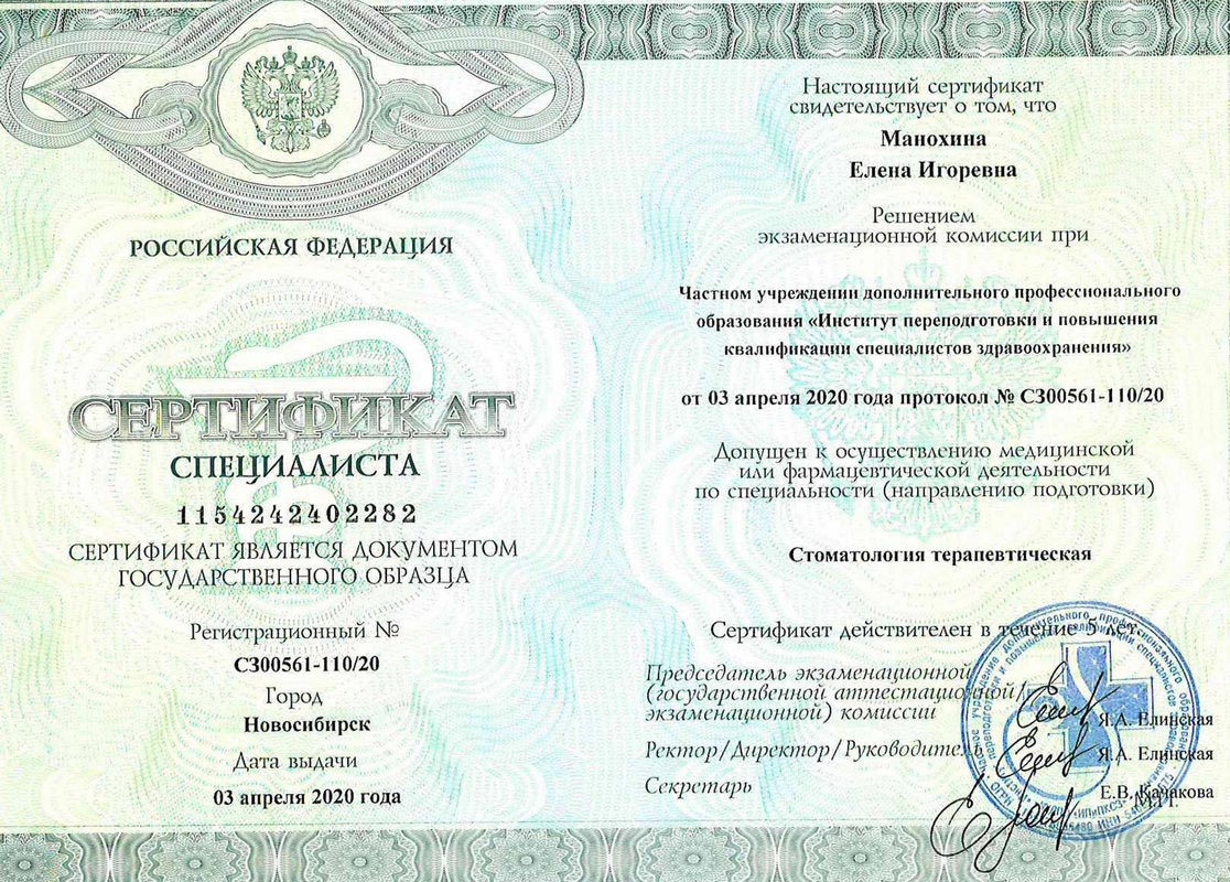 Диплом о профессиональной переподготовке и сертификат специалиста «Стоматология терапевтическая» «Институт переподготовки и повышения квалификации специалистов здравоохранения», г. Новосибирск. Сертификат действителен 5 лет.