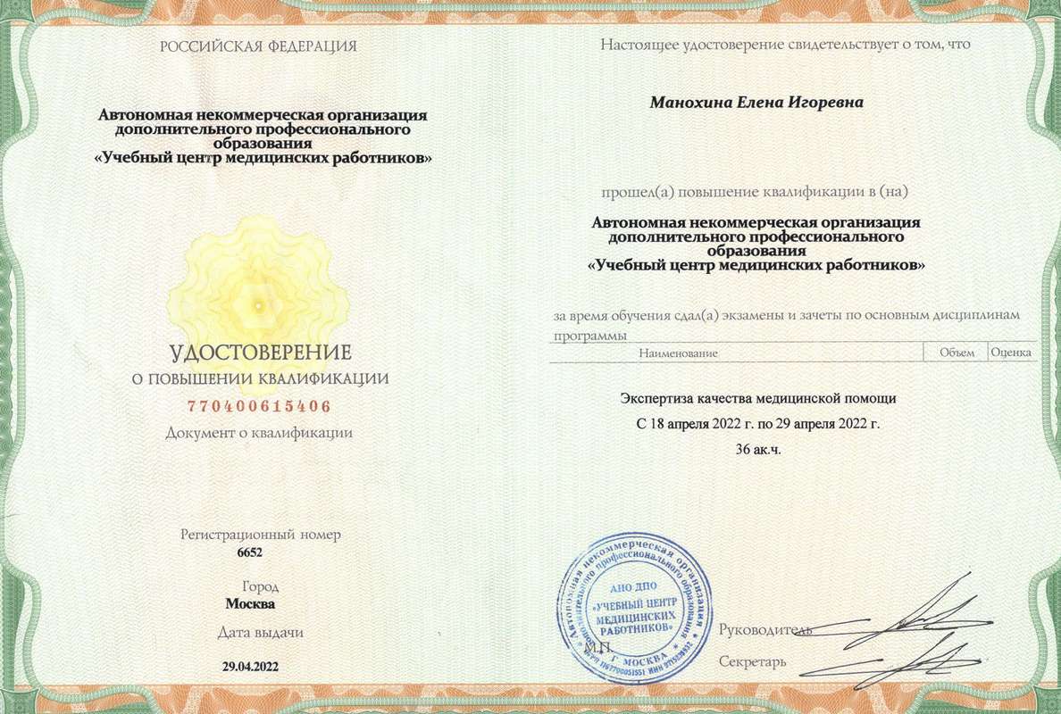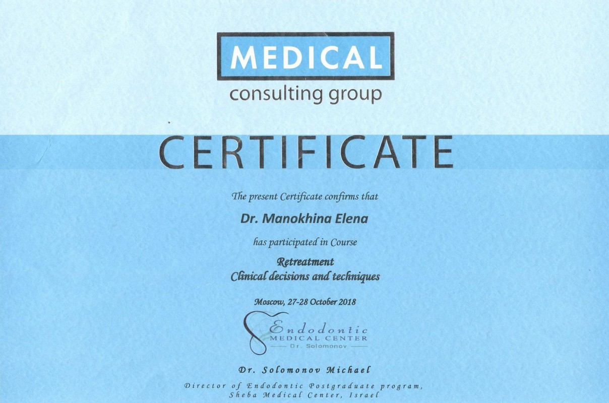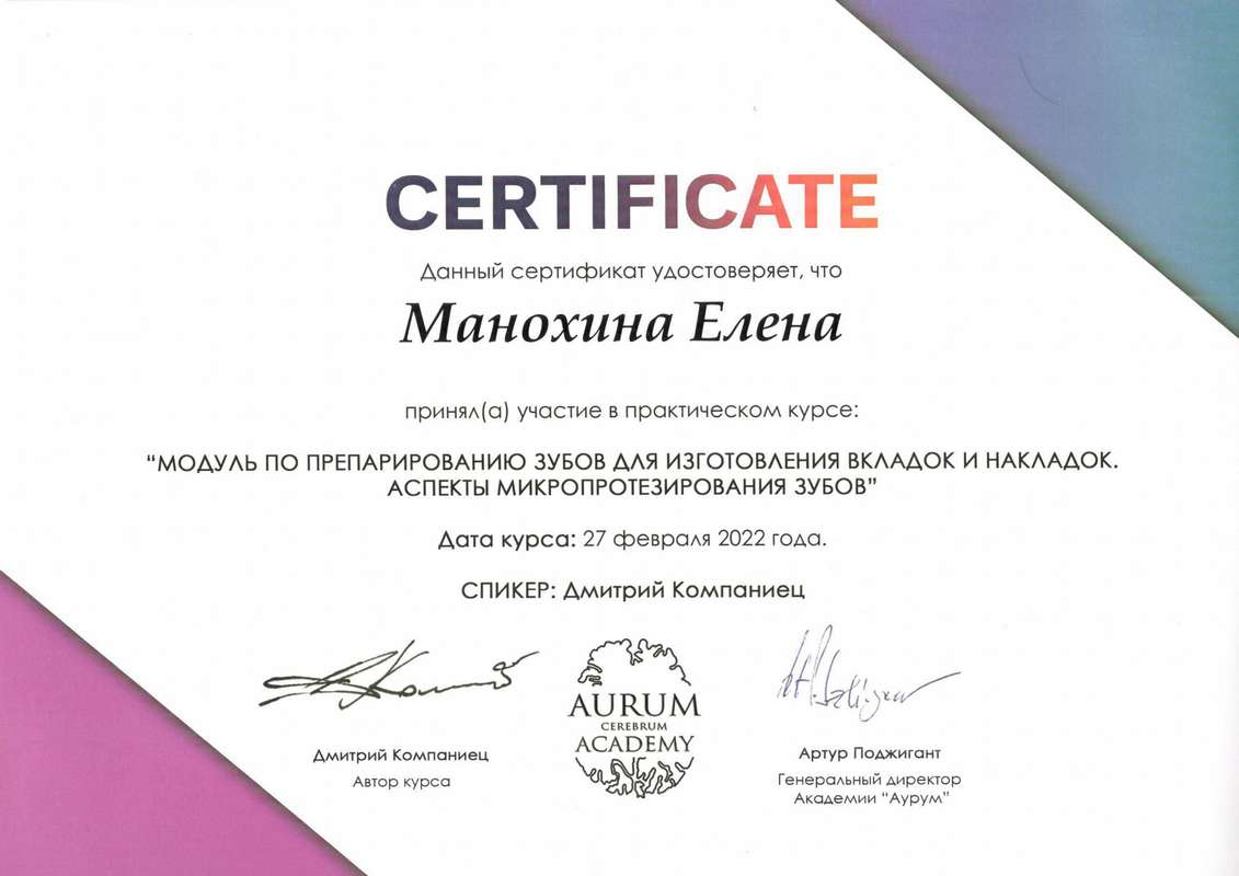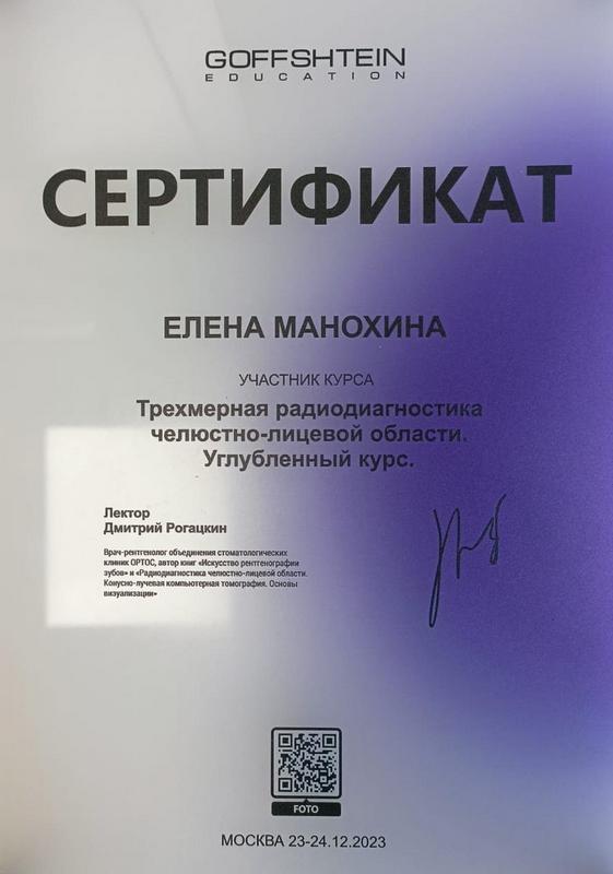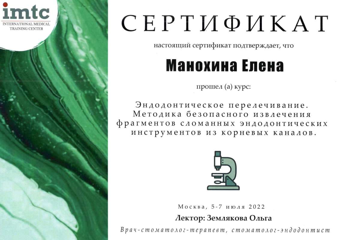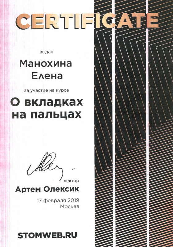 Диплом о профессиональной переподготовке и сертификат специалиста «Стоматология терапевтическая» «Институт переподготовки и повышения квалификации специалистов здравоохранения», г. Новосибирск. Сертификат действителен 5 лет.