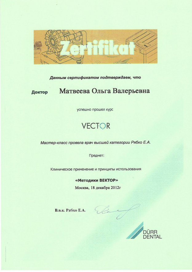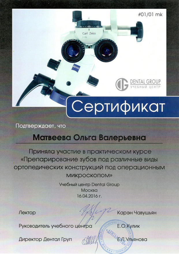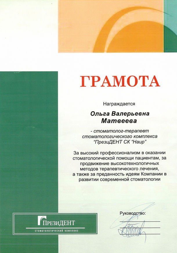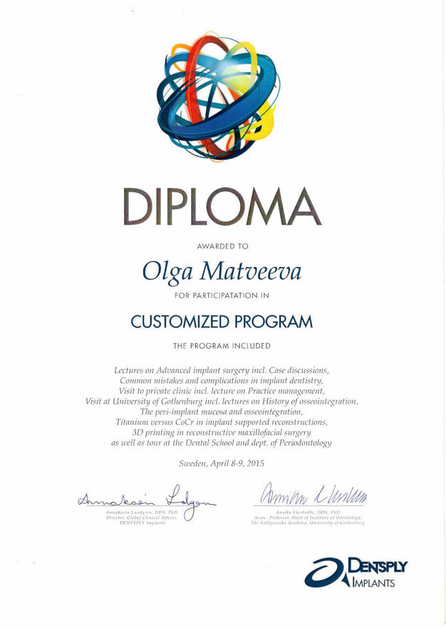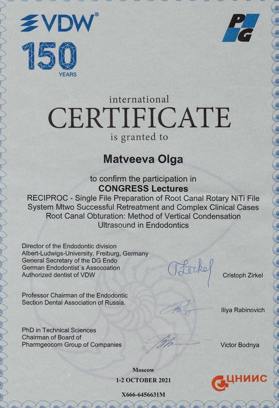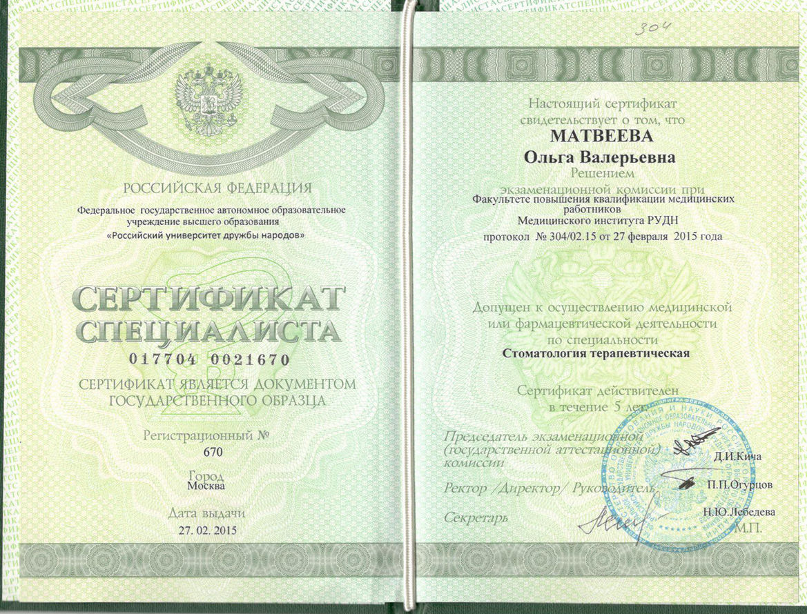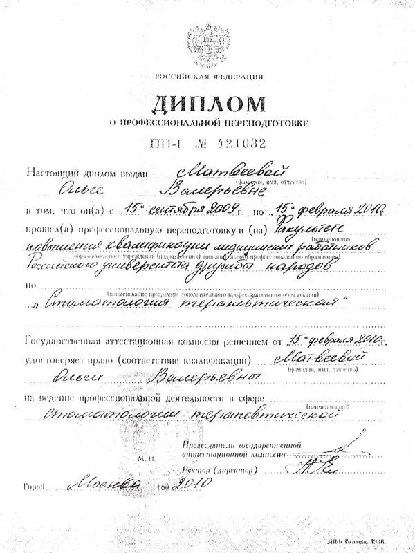 Диплом по профессиональной переподготовке по специальности «Стоматология терапевтической» РУДН, г.Москва;