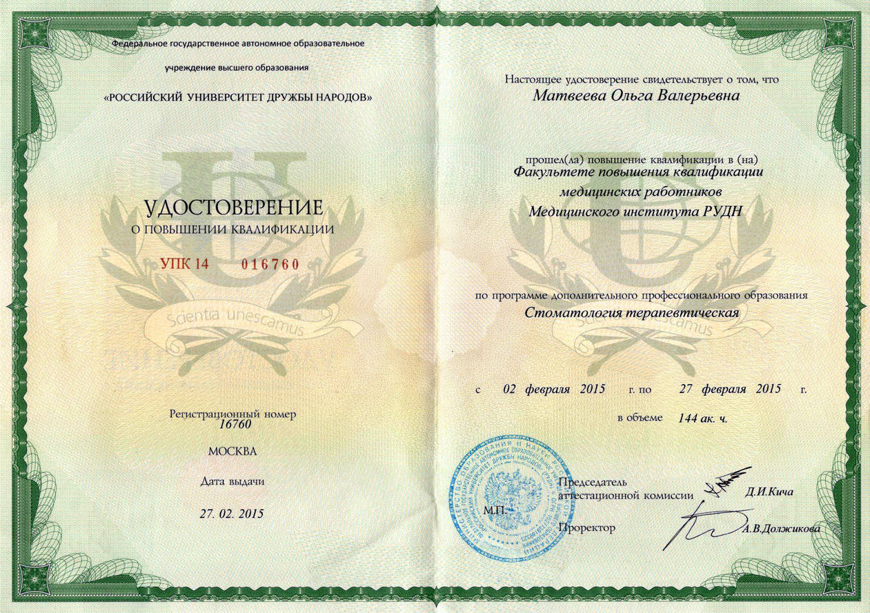 Удостоверение о повышении квалификации «Стоматология терапевтическая», РУДН, г.Москва;