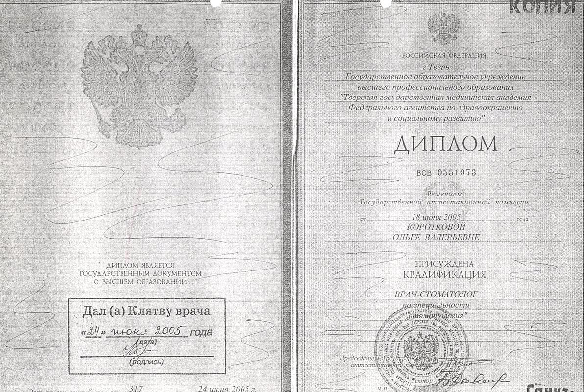 Диплом по специальности «Стоматология», ГОУ высшего профессионального образования «Тверская государственная медицинская академия Федерального агентства по здравоохранению и социальному развитию», г.Тверь;