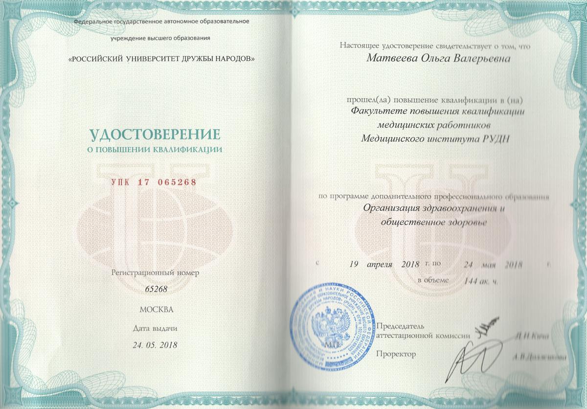 Удостоверение о повышении квалификации «Организация здравоохранения и общественное здоровье», Центр ДПО Образовательный стандарт, г.Москва.