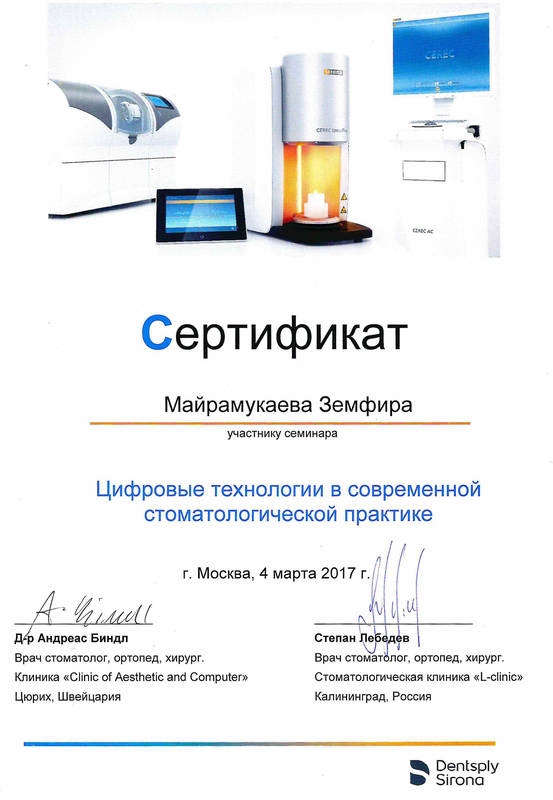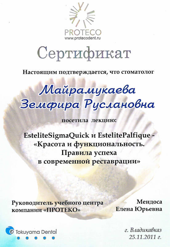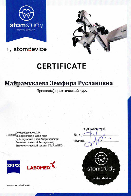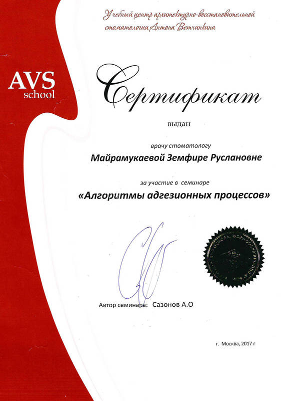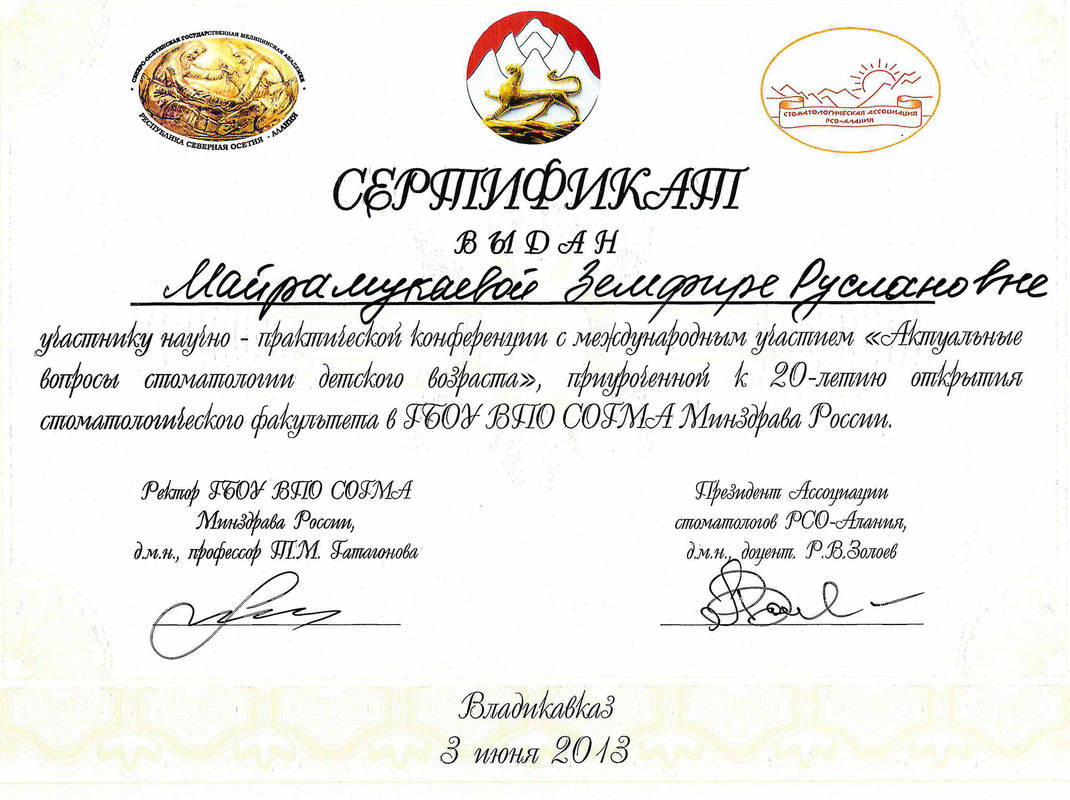 Диплом о профессиональной переподготовке «Стоматология терапевтическая» ГБОУВПО «Северо-Осетинская государственная медицинская академия»;