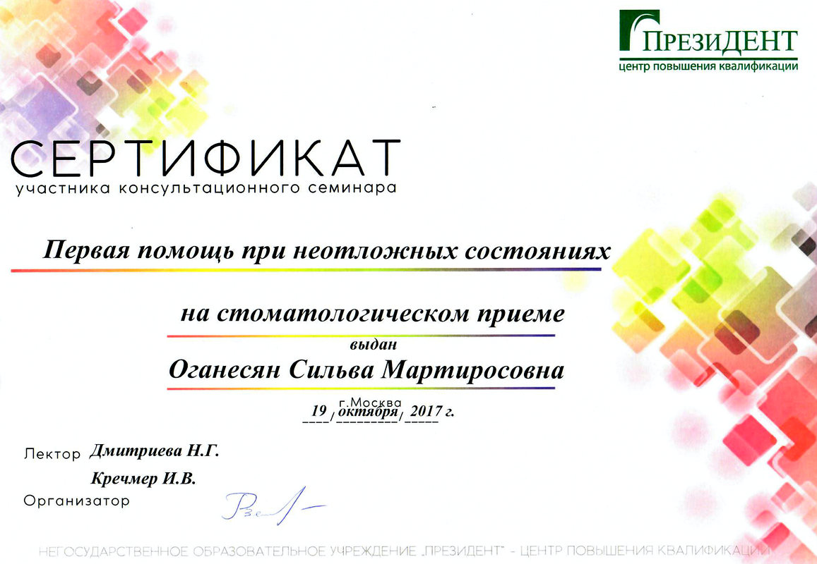 - квалификация по специальности «Стоматология профилактическая»20192019