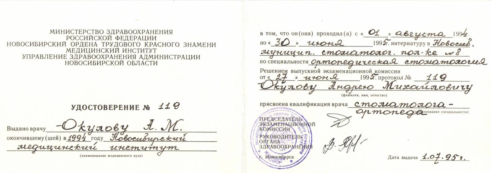 «Новосибирский Медицинский институт» — интернатура по специальности «Ортопедическая стоматология». Квалификация «Стоматолог- ортопед»