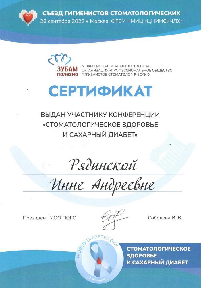 2022г. — участник конференции «Стоматологическое здоровье и сахарный диабет», Президент МОО ПОГС Соболева И.В.