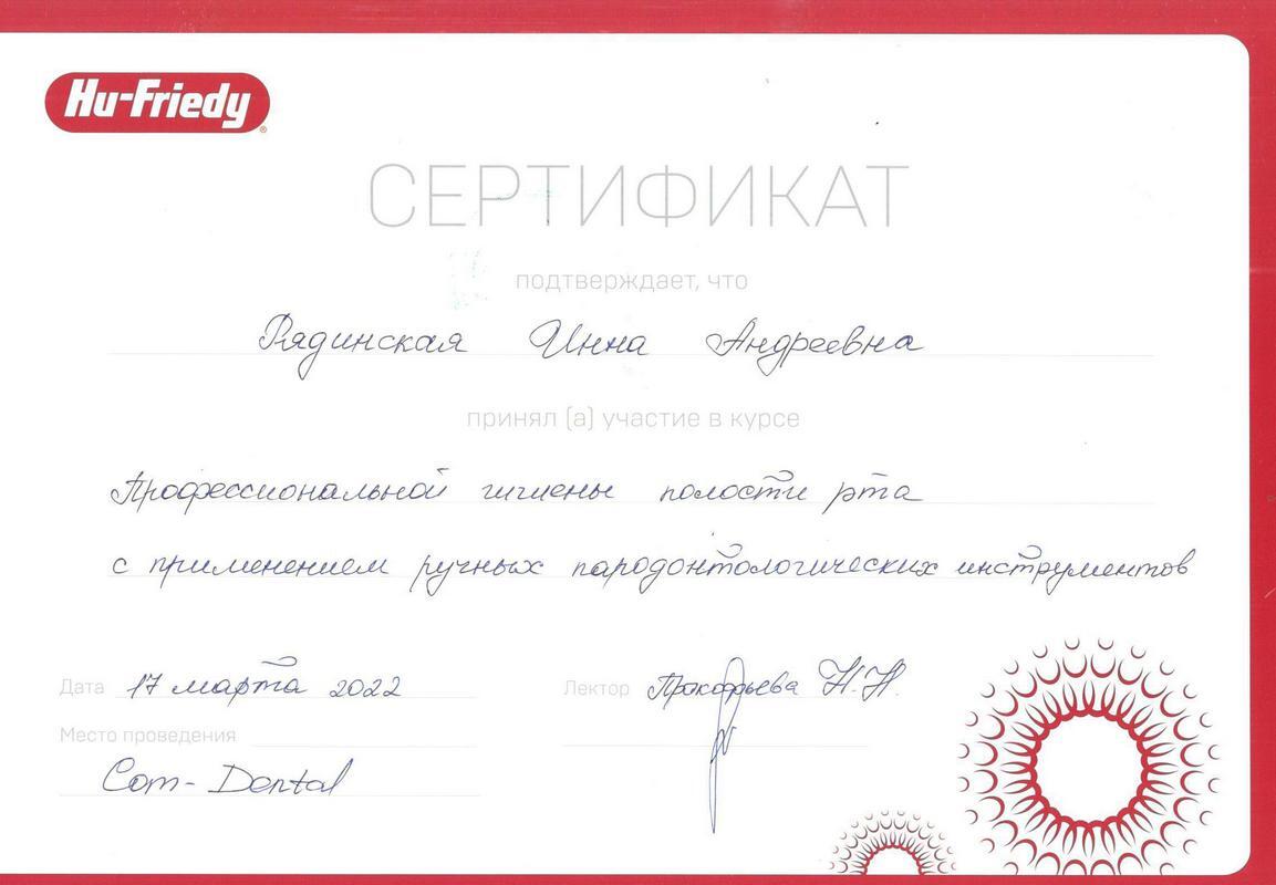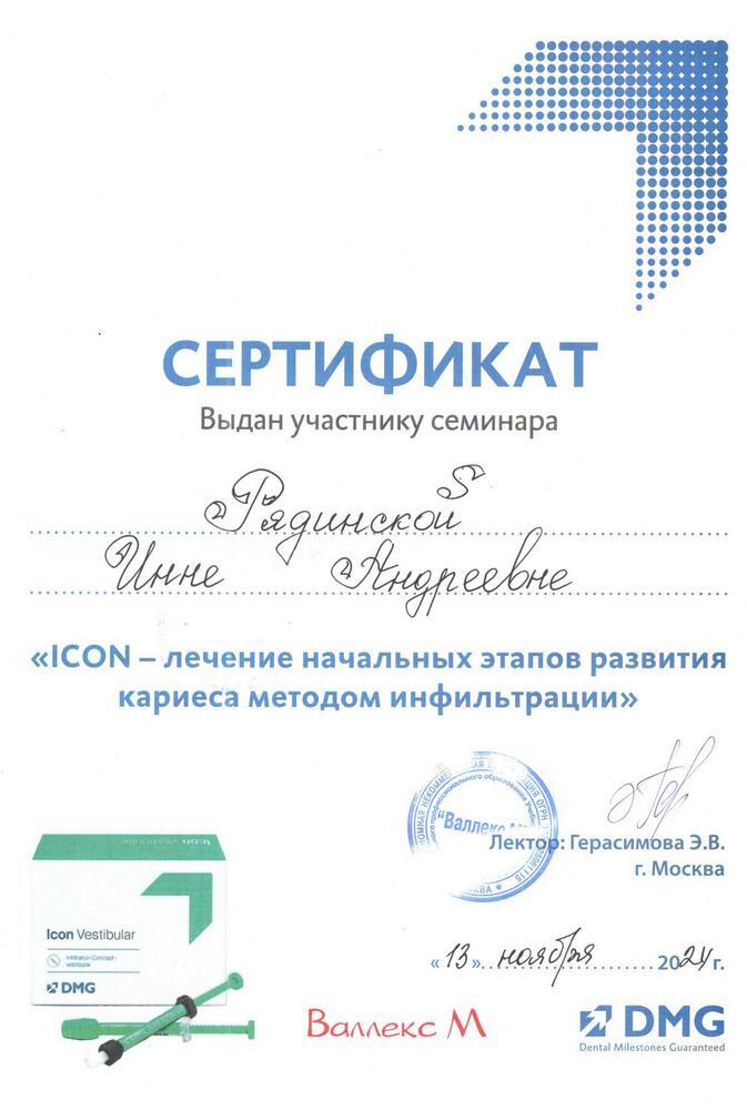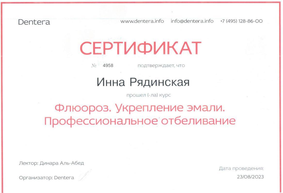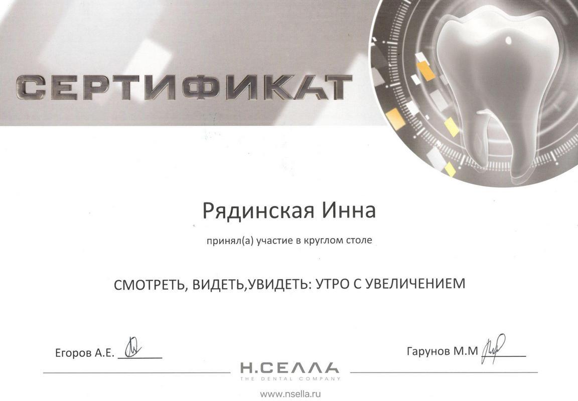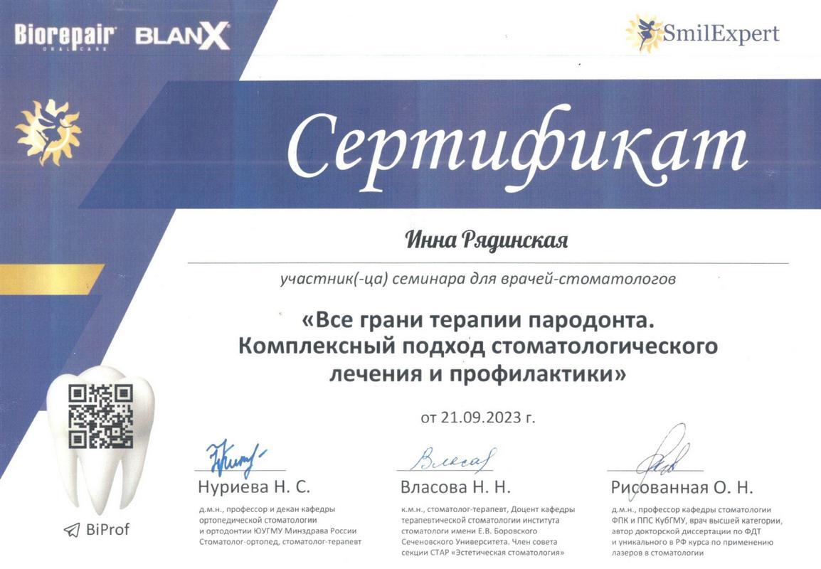 2020г. — сертификат специалиста по специальности «Стоматология терапевтическая «ООО «Учебный центр «Академия профессионального развития».Сертификат действителен 5 лет