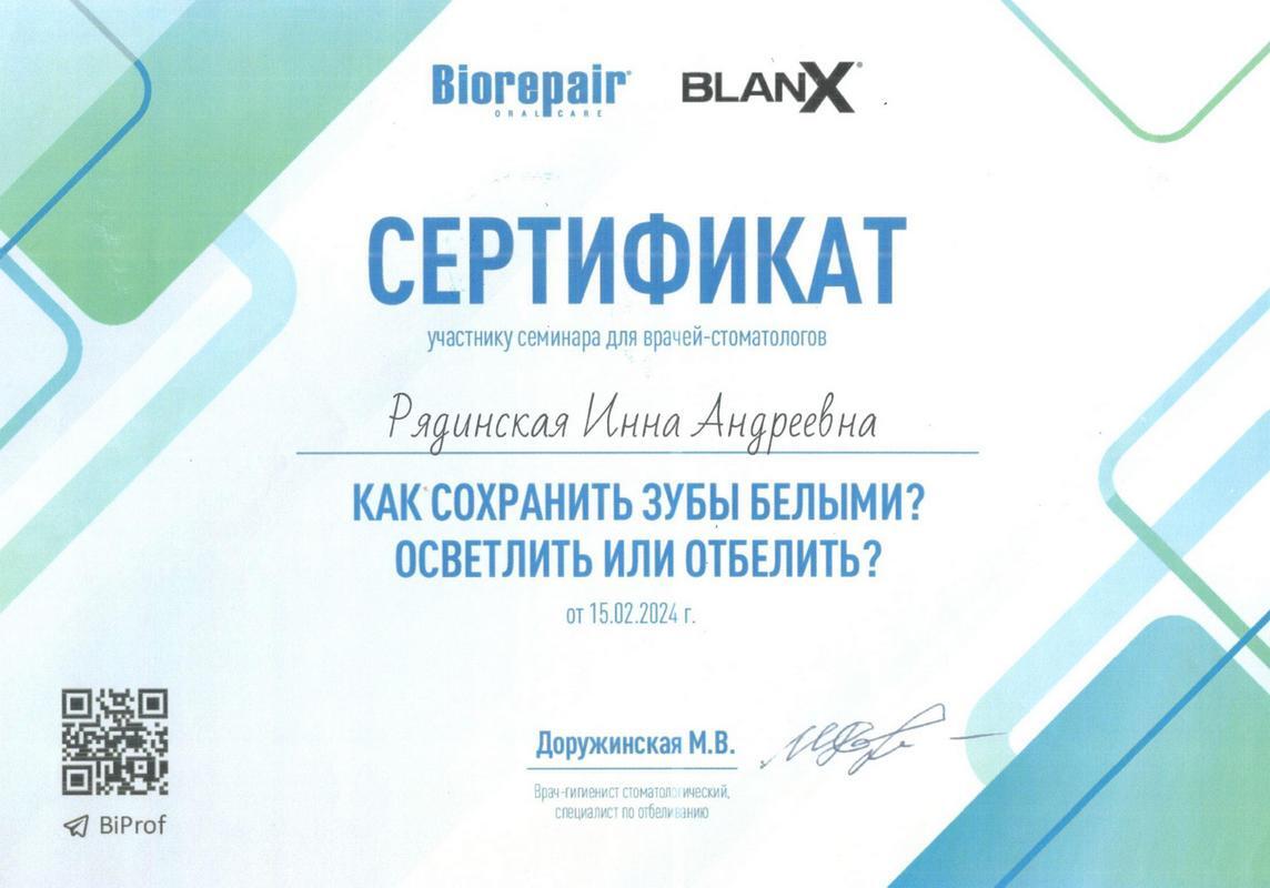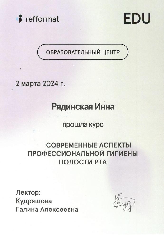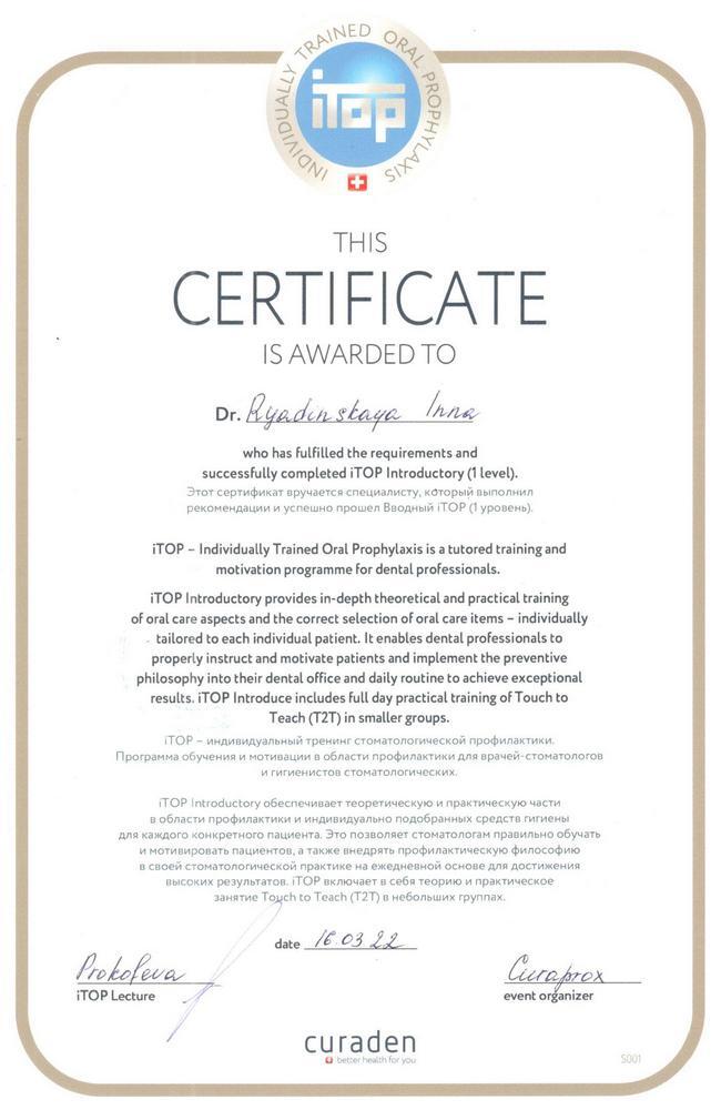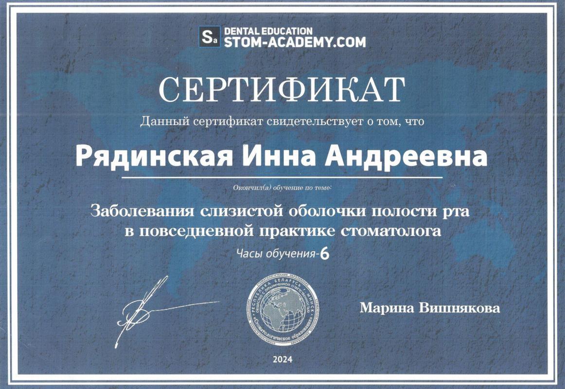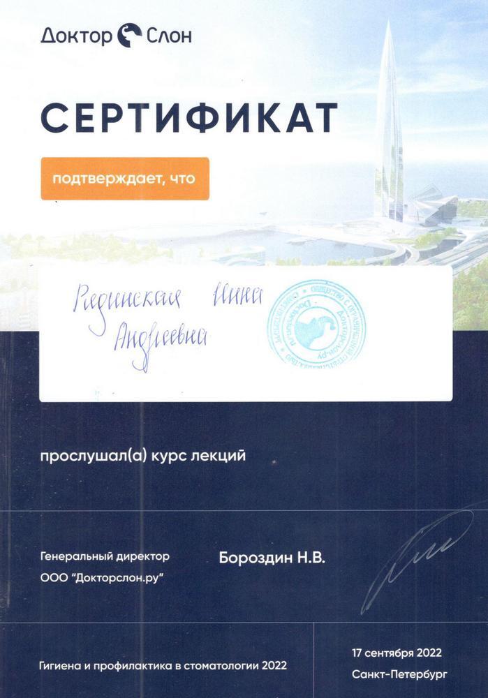2020г. — сертификат специалиста по специальности «Стоматология терапевтическая «ООО «Учебный центр «Академия профессионального развития».Сертификат действителен 5 лет
