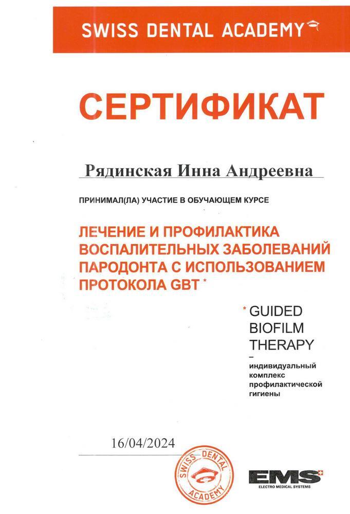 2024г. — «Лечение и профилактика воспалительных заболеваний пародонта с использованием протокола GBT» Swiss Dental Academy